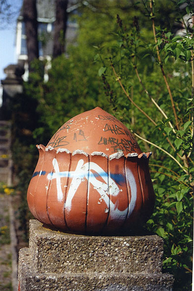 Die vier Schmuckornamente auf den jeweils östlichen und westlichen Begrenzungspfosten der umzäunten Platzanlage mit Sitzbänken sind nach identischen Formen gegossen worden. Auf den ersten Blick wirken sie wie Früchte, bei genauerem Hinsehen wird deutlich, dass es sich um weibliche Brüste, umgeben von Blätterkränzen handelt (Susannre Kähler).