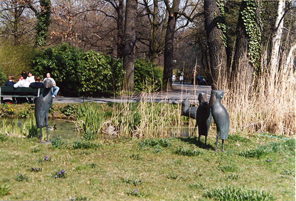 An einem Teich sind die vier Standbilder der Schuhschnäbel naturalistisch gruppiert, drei der in unterschiedlichen Haltungen und etwa natürlicher Größe dargestellten Vögel stehen rechts in einer Gruppe, der vierte Vogel befindet sich links in einiger Entfernung. Die Schnäbel der Vögel haben eine braune Patina, die übrigen Körperteile sind dagegen mit einer grünlichen Patina überzogen. Die Vögel sind in stilisierter Form mit glatter Oberflächengestaltung wiedergegeben (Susanne Kähler).