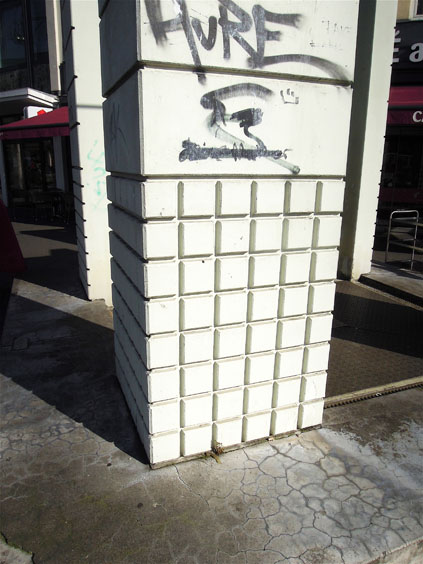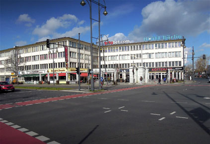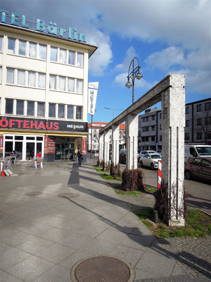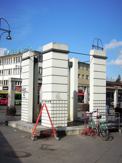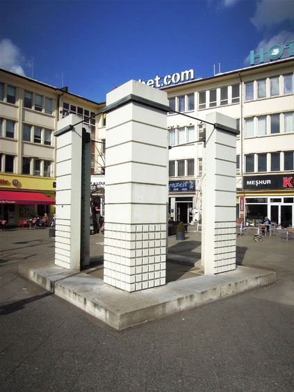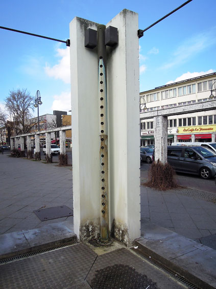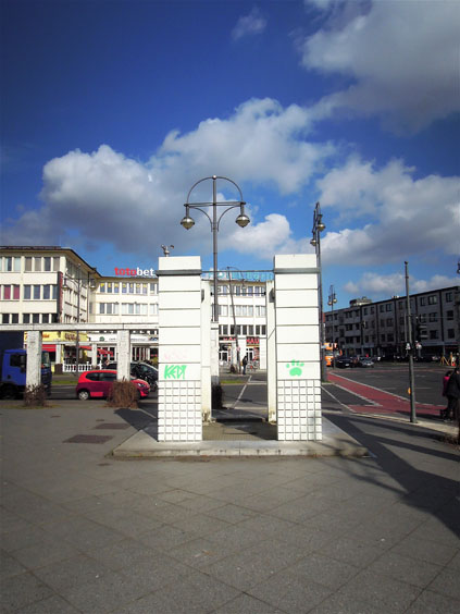 Die aus vier gleich gestalteten Brunnenanlagen bestehende Installation „Vier Wassertempel“ bespielt die Kreuzung Scharnweberstraße, Kurt-Schumacher-Damm. An jeder der vier Kreuzungsecken steht ein aus Beton-Fertigteilen gestalteter, nach oben hin offener symbolisierter Brunnen-Tempel. Seitwärts zu den Straßen hin ist jeder der Tempel von zwei einreihigen, begrünten Pergolen flankiert.