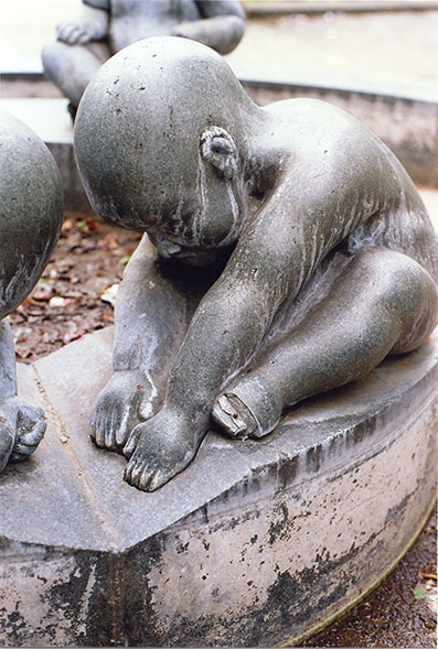 Die äußere Form des Brunnens wird durch einen schlichten runden Rand aus glattem polierten Diabasgestein gebildet, der an der Südseite eine keilförmige Kerbe aufweist. Im Zentrum des Brunnens steht die innere Schale mit einem weiteren Ring, in den ebenfalls an der Südseite eine Kerbe eingearbeitet wurde, aus der – wie beim äußeren Ring auch – bei Betrieb Wasser fließt. Die Düse im Zentrum der Anlage deutet darauf hin, dass es sich um einen Springbrunnen handelt. Auf dem Rand der inneren Brunnenschale sitzen vier Kinderfiguren. Vorne, rechts und links des keilförmigen Ausflusses sitzen sich zwei spielende Kleinkinder gegenüber, die ihre Hände – bei Brunnenbetrieb – in das herausfließende Wasser halten und den Strom beobachten. Der hintere Teil dieses Brunnens ist durch eine Stufe etwas erhöht. Hier sitzen zwei Mädchenfiguren, die rechte mit überkreuzten Beinen, die linke knieend, beide halten ihre Gesichter nach oben um das Springbrunnenwasser zu spüren.