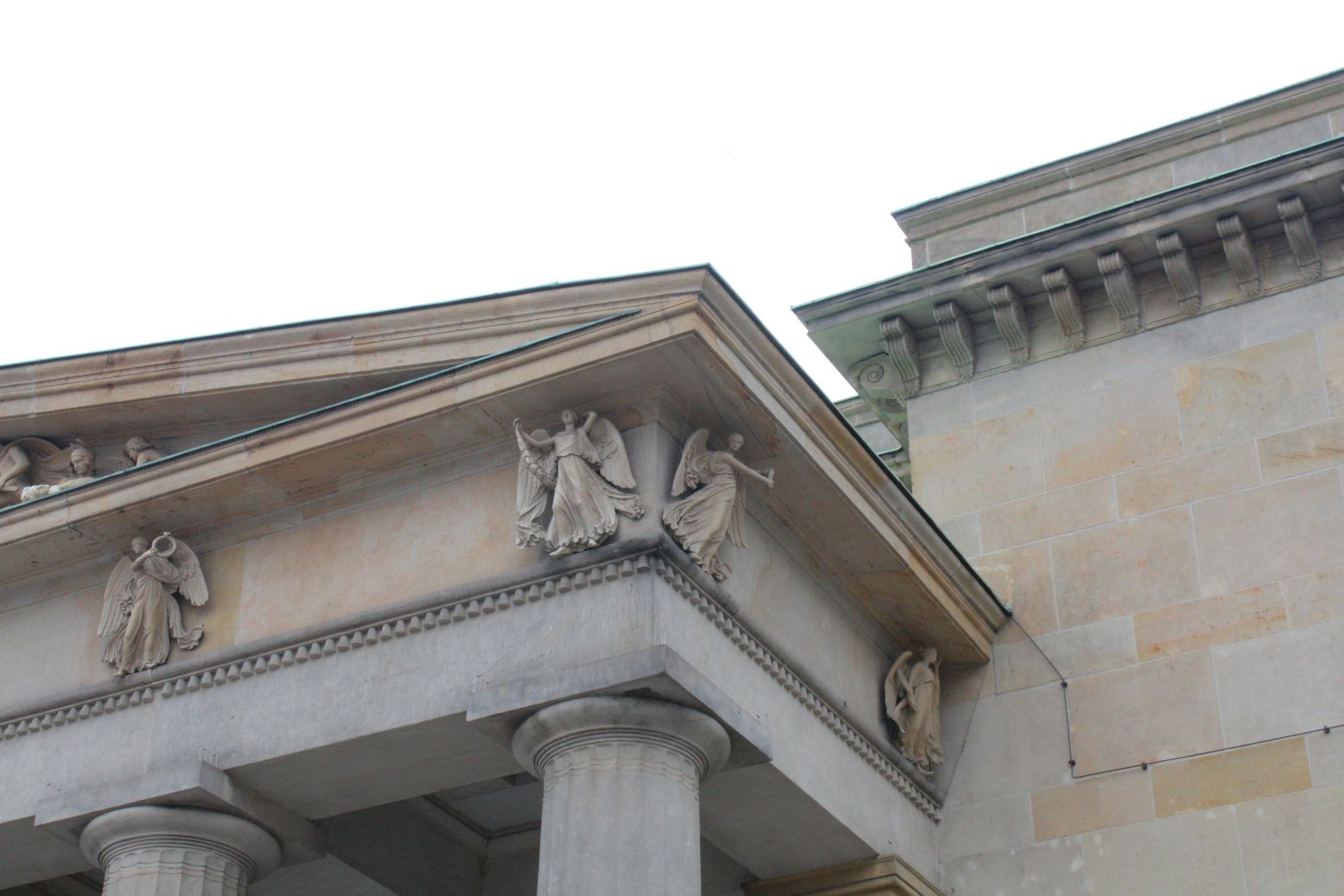 Am Fries des Gebälks der Neuen Wache befinden sich genau oberhalb der Säulen sowie an den beiden Seiten der Vorhalle insgesamt zehn Viktorien. Die mit langen Gewändern bekleideten, geflügelten Gestalten halten Kränze, Girlanden und Palmblätter in den Händen (Nicola Vösgen).