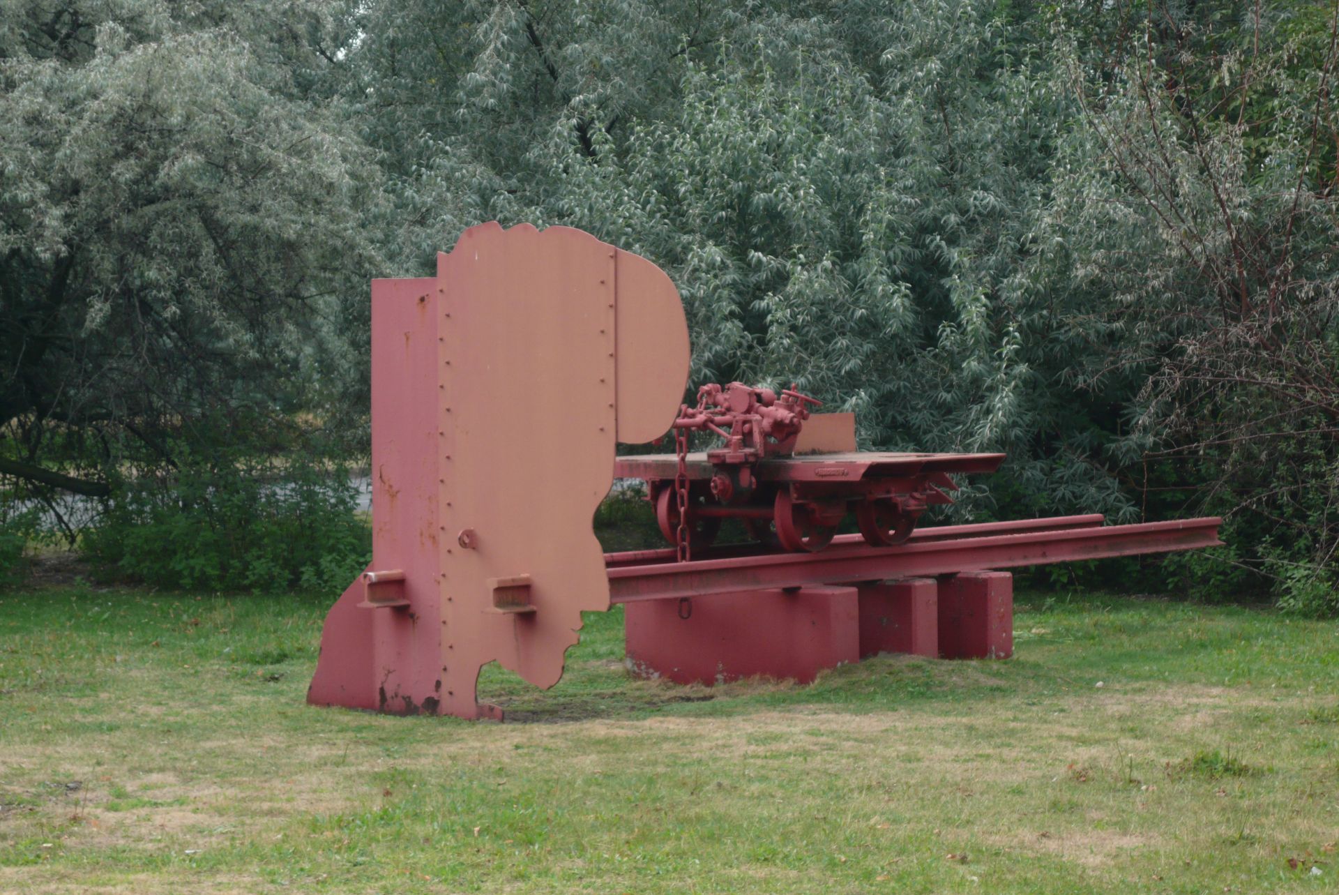 Drei rosa gefasste Betonsockel tragen rosa gefasste Eisenbahnschienen, auf denen ein Wagen mit technischem Apparat steht. Ausgestanzt aus einer Fläche des auf Rädern stehenden Gerätes ist die Form eines Eisernen Kreuzes, welches an anderer Stelle aufgeschweißt wurde. Auf der westlichen Schiene findet sich die Bezeichnung. Nördlich an die Schienen angeschweißt, von ihnen durchstoßen und mit dem Schienenwagen durch ein Stahlseil verbunden ist der stählerne Schattenriss des Profilkopfes der Politikerin Rosa Luxemburg, hellfleischfarben-rosa gefasst (Jörg Kuhn).