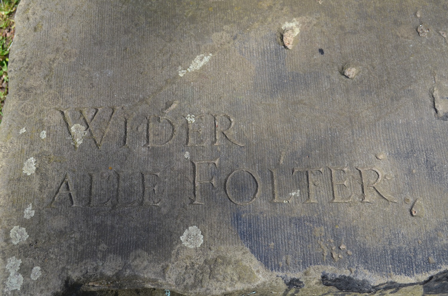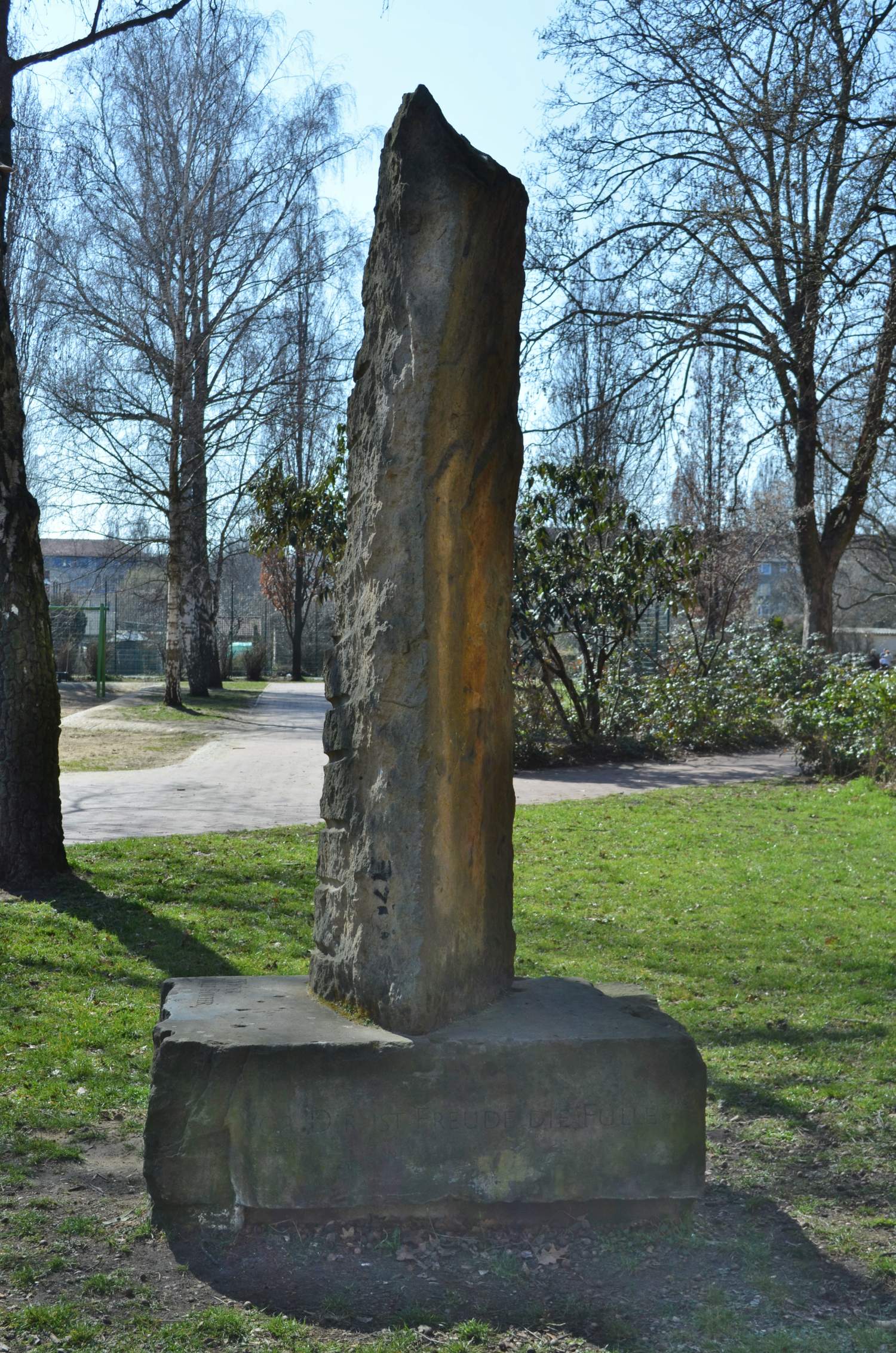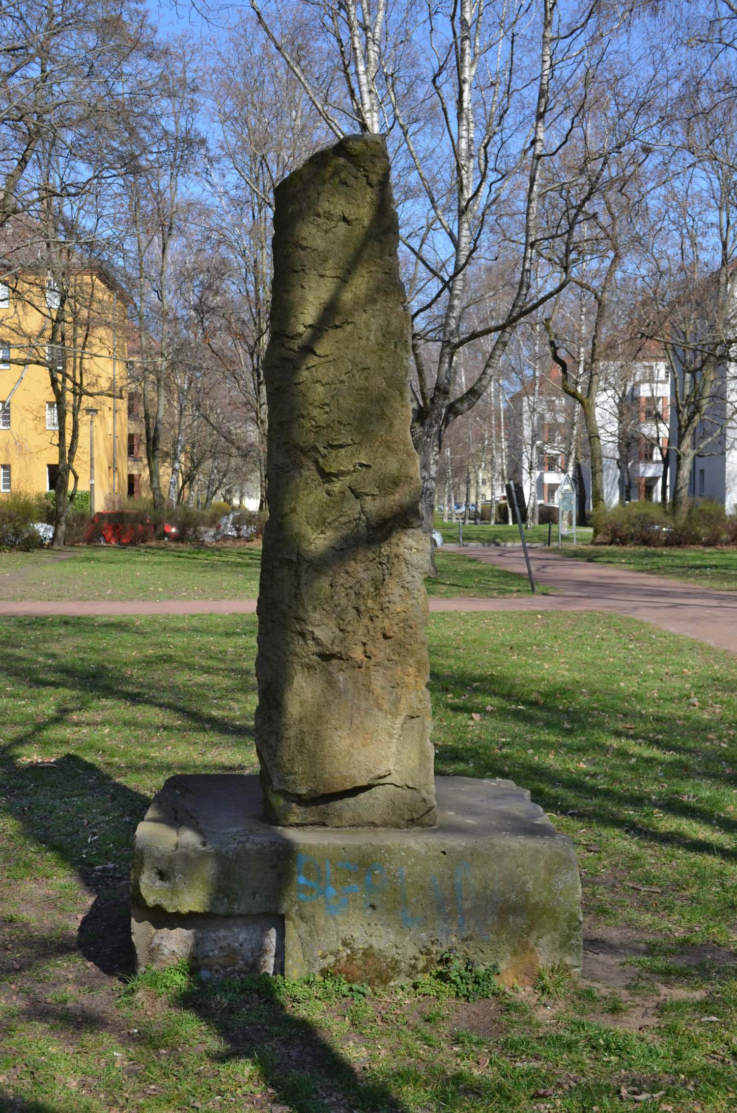 Abstrakte Sandsteinskulptur mit irregular geformter Oberfläche, die vertikal in die Höhe geht. Die Frontansicht der Skulptur weist am linken Rand gerade Einkerbungen (Schnitte) auf. Die Figur steht auf einem quaderförmigen Sockel, der ebenfalls Irregularitäten aufweist und mit Inschriften versehen ist. (Pauline Ahrens).