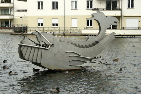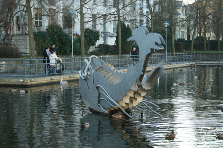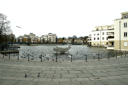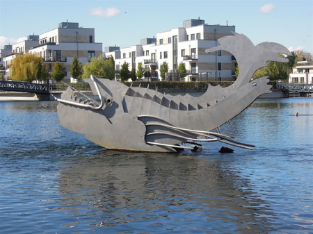 Inmitten eines Flachwasserbeckens erhebt sich eine große, fünf Meter lange Fischplastik, die an einen stilisierten Walfisch erinnert. Der Fisch ist eine offene Form, die aus Röhren und einzelnen Edelstahlplatten mit Laser zusammengeschweißt ist. Sie steht auf einer Stahlstützkonstruktion über dem Auslauf der Freigefälleleitungsanlage der nahen Phosphateliminationsanlage, aus dem Wasser-Fontänen hervorquellen. So entsteht der Eindruck, als schwimme der Fisch im Wasser des Beckens (Jürgen Tomisch, Barbara Anna Lutz).