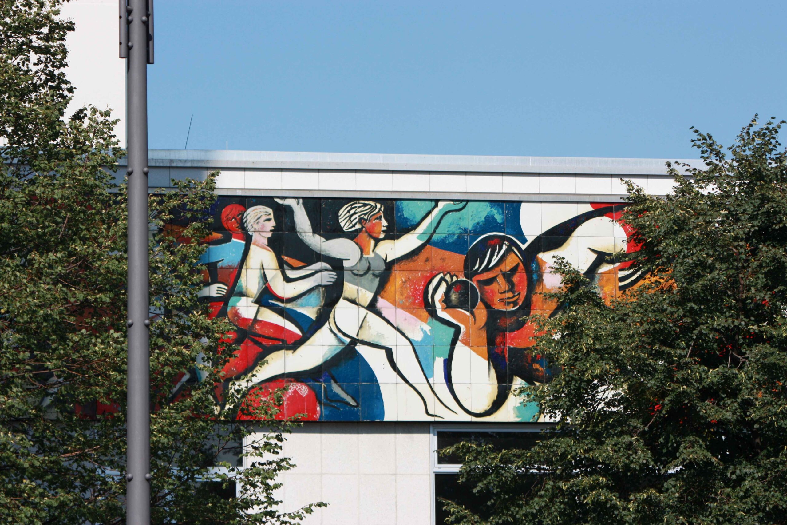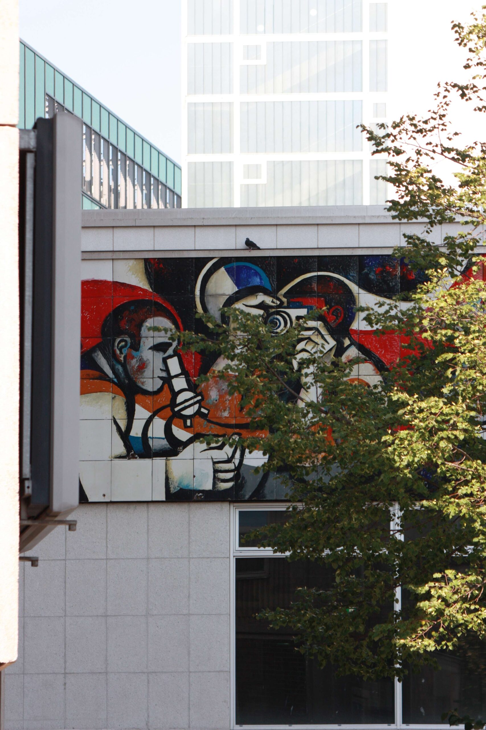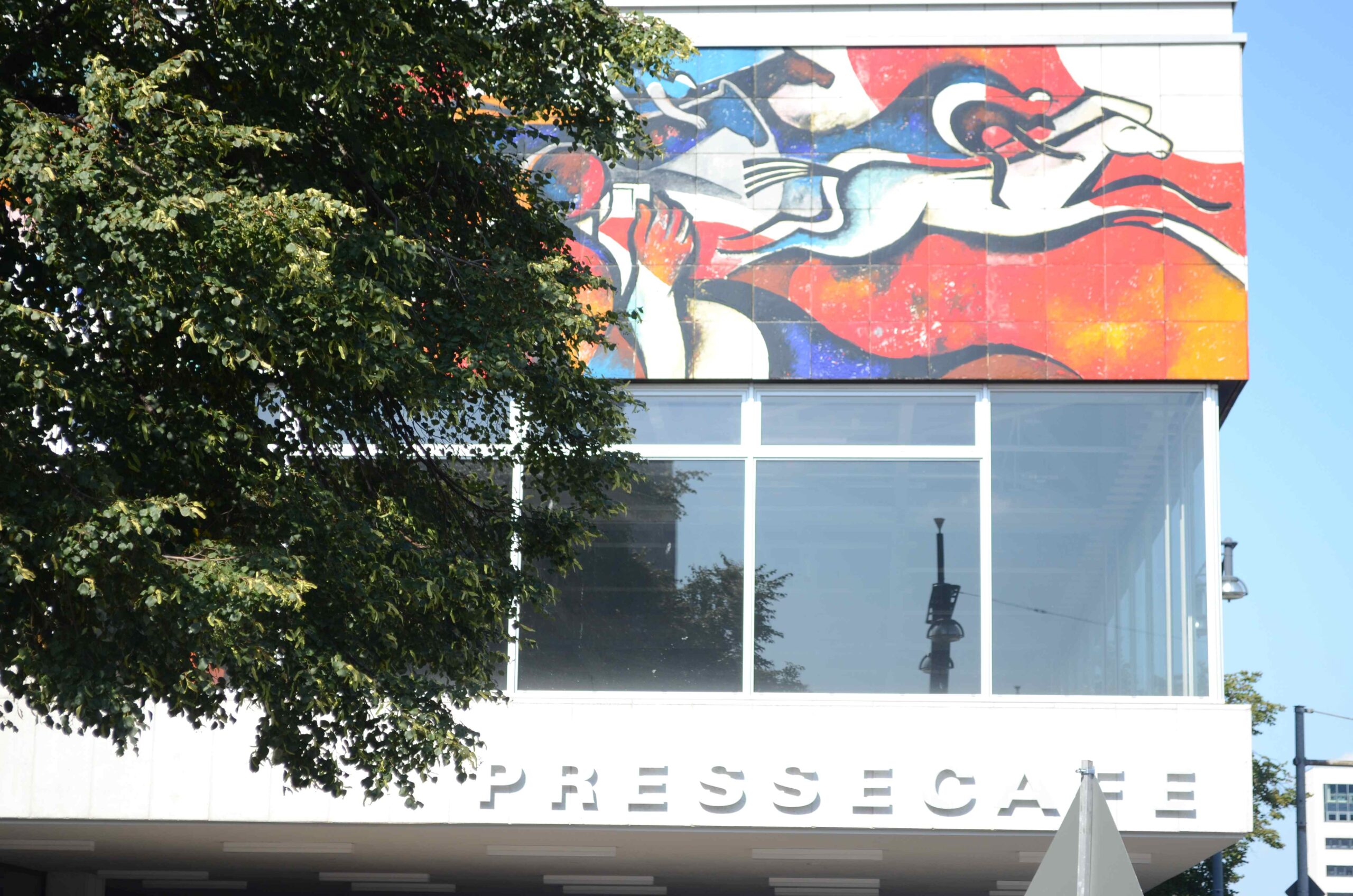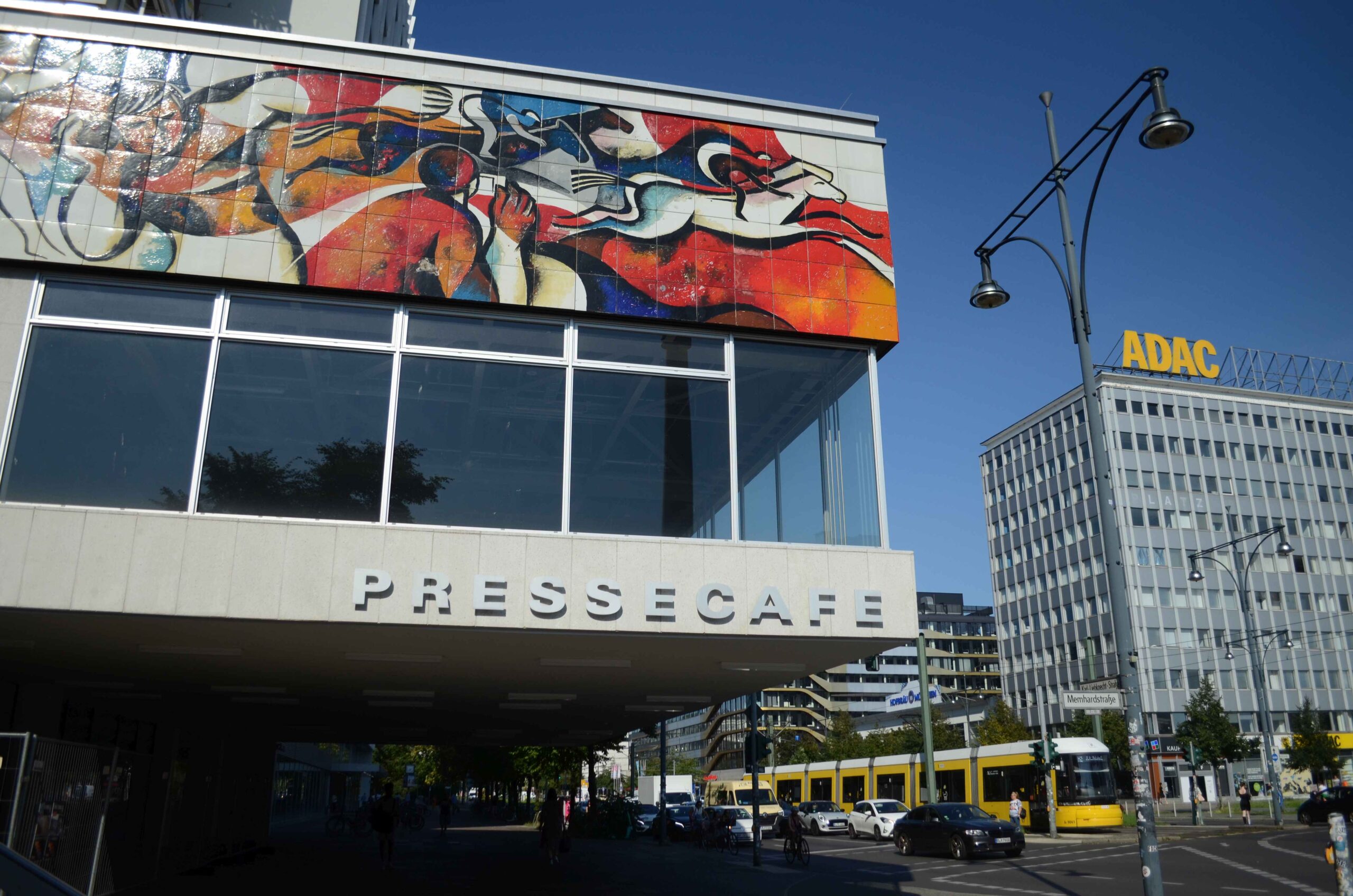 Über der großflächigen Fensterfront, an der Attika des Pavillons des Pressecafés am Alexanderplatz, befindet sich ein umlaufendes Fassadenfries, zusammengesetzt aus bunten Emaille-Kacheln, mit dem Titel “Die Presse als Organisator”. Die bunten, bemalten Emaille-Kacheln sind überwiegend in den Farben Rot, Blau, Ocker, Weiß und Schwarz gehalten. Die Bemalung darauf setzt sich aus unterschiedlichen Szenen zusammen, welche die Verlags- und Redaktionsarbeit in der DDR thematisieren. Diese zeigen Menschen bei der Redaktionsarbeit und beim Konsum von Nachrichten. Durchsetzt werden die Szenen mit Symbolen wie der Friedenstaube, einem Porträt von Karl Marx sowie Druckerzeugnissen, auf denen bruchstückhafte Begriffe wie “Rosa” oder “die Rote” zu lesen sind. Das Wandfries ist geprägt vom Stil des sozialistischen Realismus (Layla Fetzer).