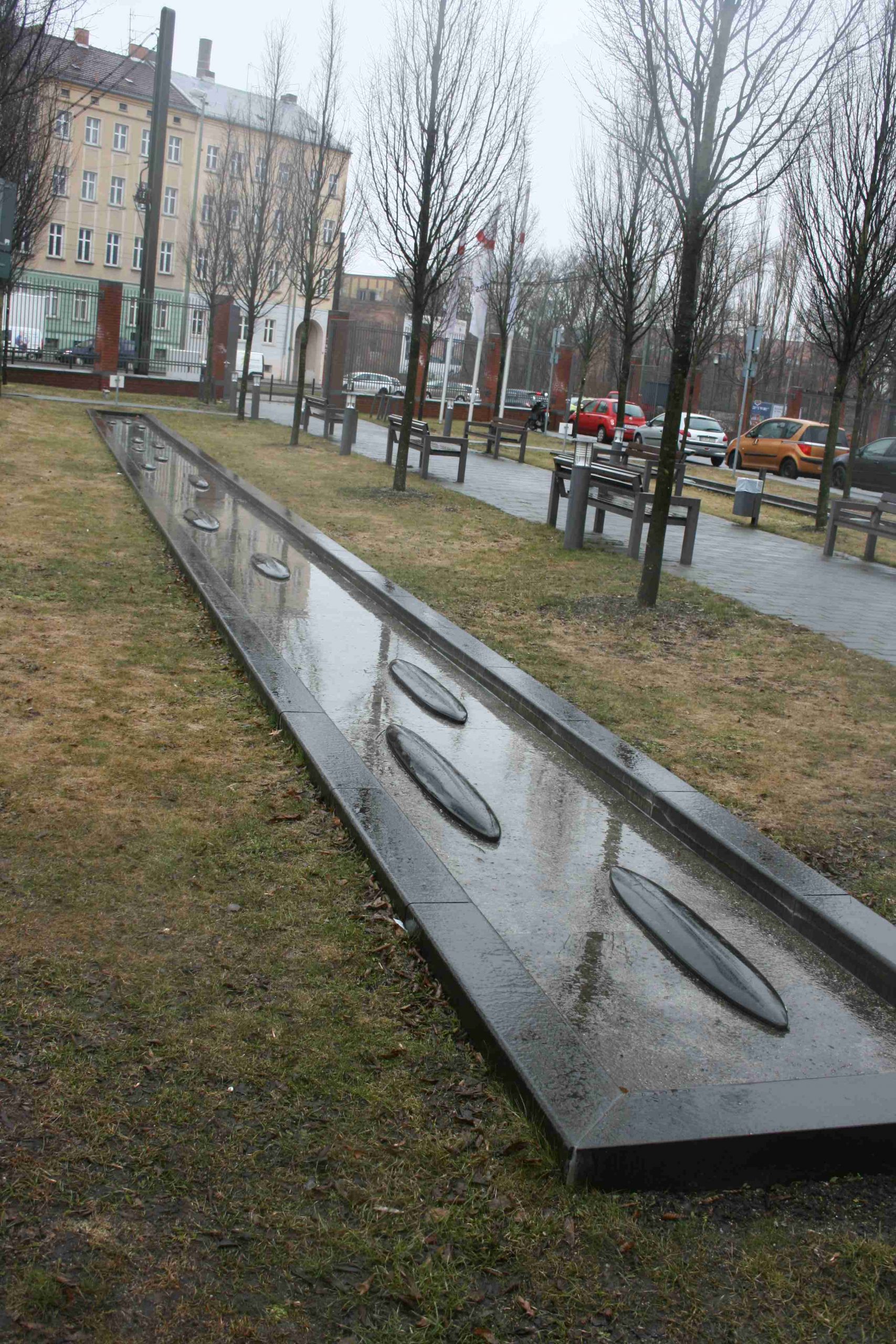 Zwei rechteckige Rasenflächen flankieren den Zugangsweg zum Haupteingang am Neubau des Vivantes-Klinikums in Friedrichshain. In diese Rasenflächen sind zwei stark längsrechteckige Brunnenbecken eingefügt. Sie werden von Grünstreifen mit Alleenbepflanzung umgrenzt. Die flachen Brunnenränder sind aus dunklem Naturstein gefertigt, der Boden der Becken ist mit grauen Granitplatten belegt. In jedem der beiden flachen Becken liegen auf den Granitplatten 14 schwarze längliche Elemente aus Granit oder Basalt in „Schiffsform“, sie sind innerhalb der Becken nicht identisch angeordnet. Die beiden Bassins mit dem Titel „Wasserläufe“ sind als zwei stilisierte Bachläufe zu begreifen, deren Wasserfluss durch unregelmäßige angeordnete Steine lebendig wird (Jörg Kuhn).