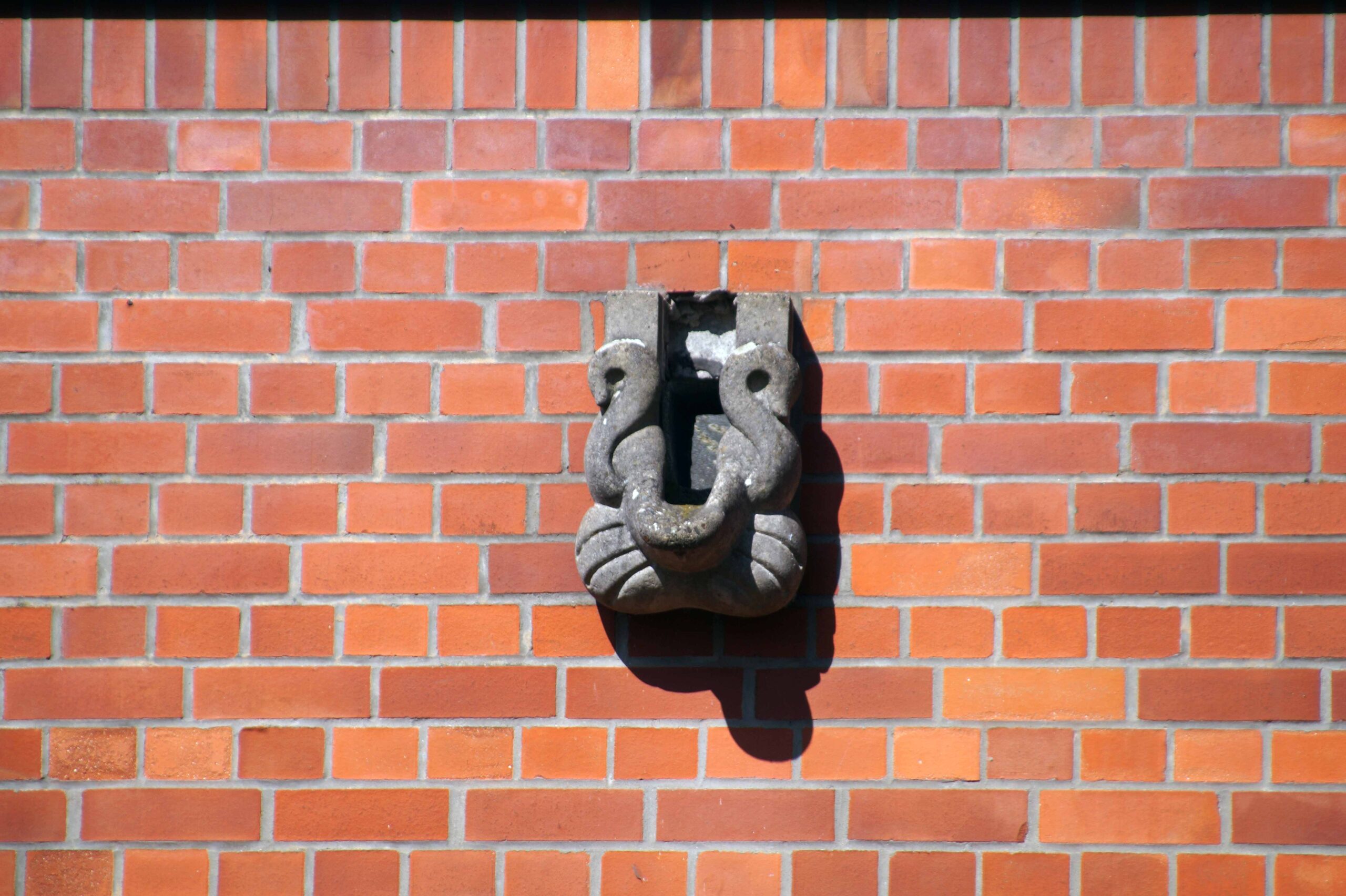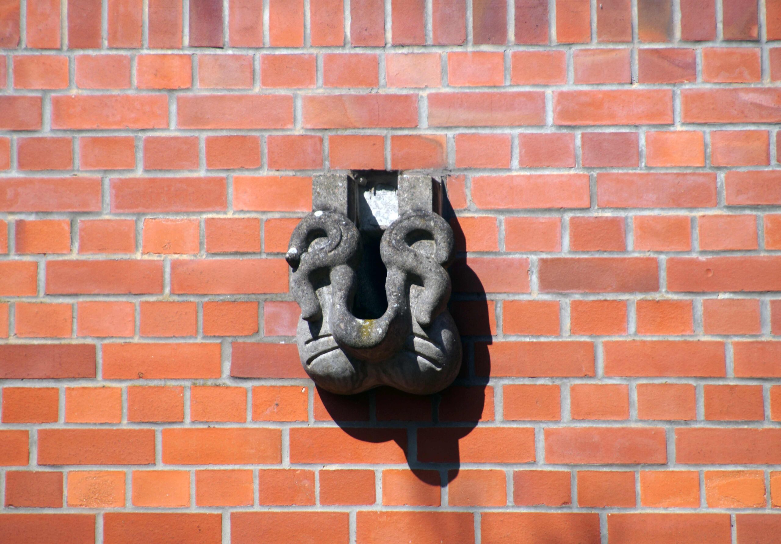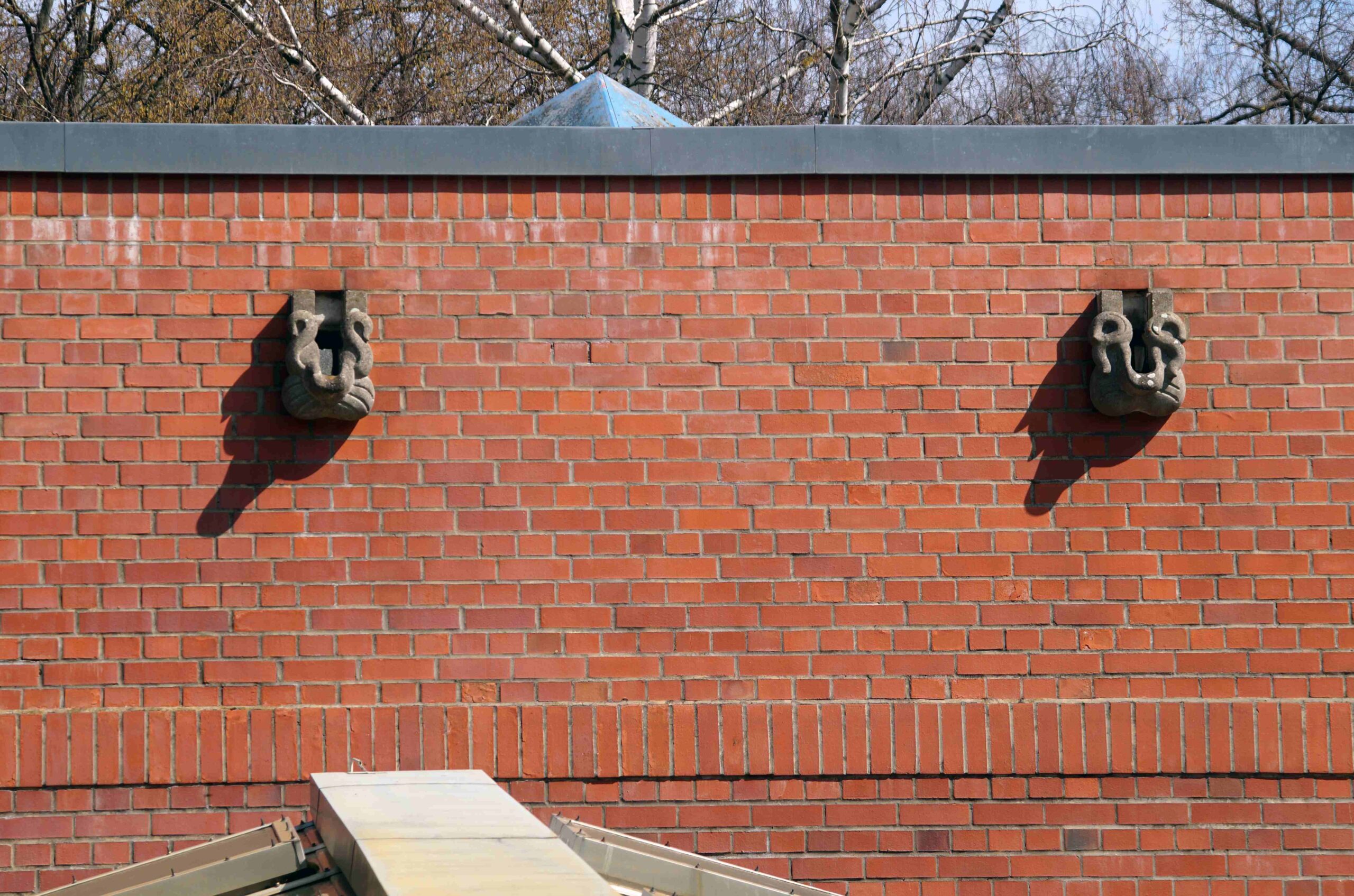 An den vier Seiten der Trauerhalle des Urnenfriedhofes Neukölln befinden sich im oberen Drittel der Fassaden je zwei Wasserspeier. Die hochrechteckigen Speier sind mit verschlungenen Formen gestaltet, die den Wasserausfluss flankieren (Nicola Vösgen).