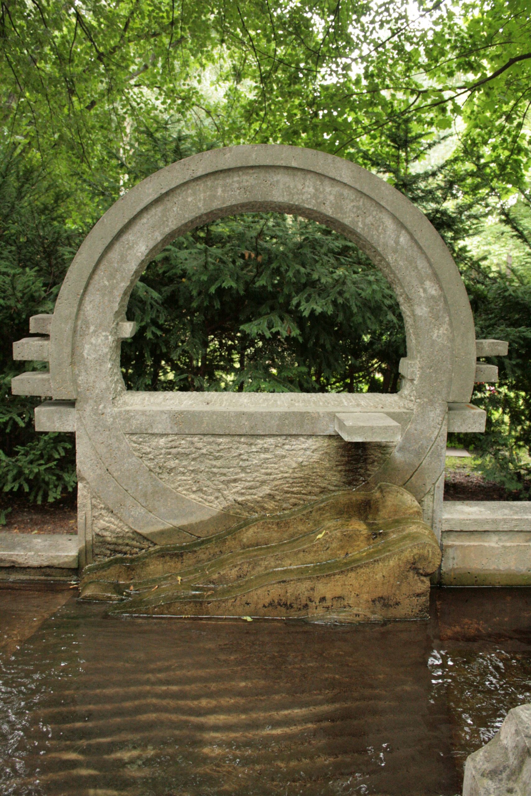 Der aus Kunststein (Beton) und Naturstein (Randauflagen) errichtete Brunnen bietet sich als künstlerisch gestaltete Landschaft dar. In stilisierte Form ist als durchbrochen gearbeitete Rückwand eine Sonne mit Wolkenumrahmung zu erkennen. Unterhalb der Sonne sind stilisierte Wellen zu erkennen. Einem in etwa halbrunden größeren Becken sind zwei kleinere halbrunde Becken zugeordnet. Das linke Becken hat einen bronzenen Wasserzulauf (aus dem größeren Becken) in zoomorpher Gestalt (Fischkopf). Ein weiterer Wasserzulauf findet sich verdeckt im Beckeninneren. Bei dem größeren Becken ist unterhalb der „Sonne“ ein Wasserzulauf zu entdecken. Von hier aus rinnt das Wasser des größeren Beckens über eine breite Stufe in das niedrigere vorgelagerte Becken (Jörg Kuhn).