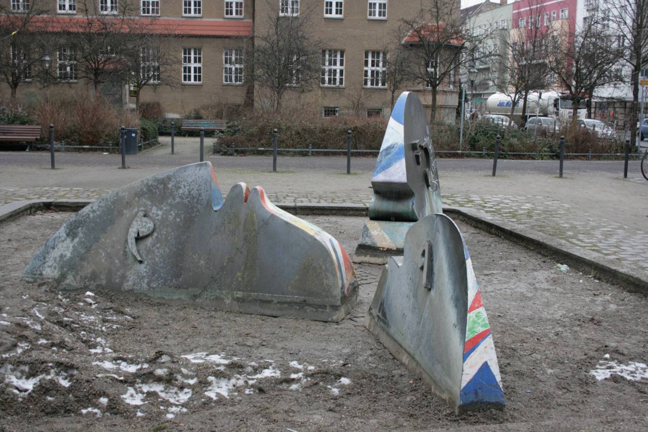 Die Brunnenanlage entstand 1993-1994 im Zusammenhang mit der Neugestaltung des dreiseitig umbauten Platzes. Das Bezirksamt Treptow ließ für 350.000 DM den zubetonierten Boden des „Pausenhofes“ entsiegeln, neue Bäume pflanzen und einen Wettbewerb zu einem Brunnen ausschreiben. Der auf fünf Künstler beschränkte Wettbewerb wurde von Rüdiger Roehl, einem im Bezirk ansässigen Metallkünstler, gewonnen. Er realisierte die Brunnenplastik zwischen Dezember 1993 und Juli 1994. Im Sommer 1994 konnte der Platz mit einem Bürgerfest eingeweiht werden. Roehl schuf mit dem Brunnen eine humorvolle Hommage an die Westberliner Musikgruppe TRIO (Jörg Kuhn).