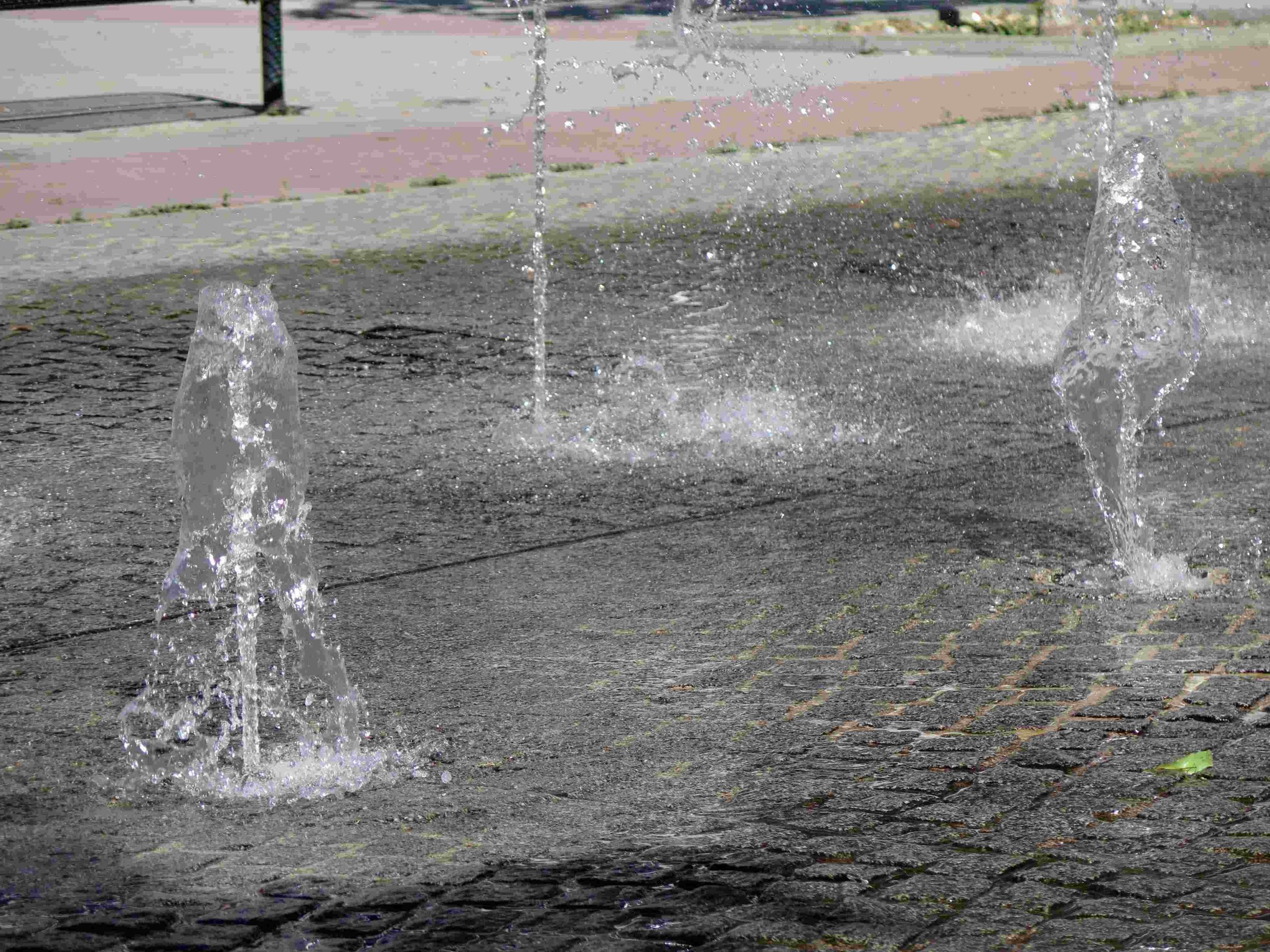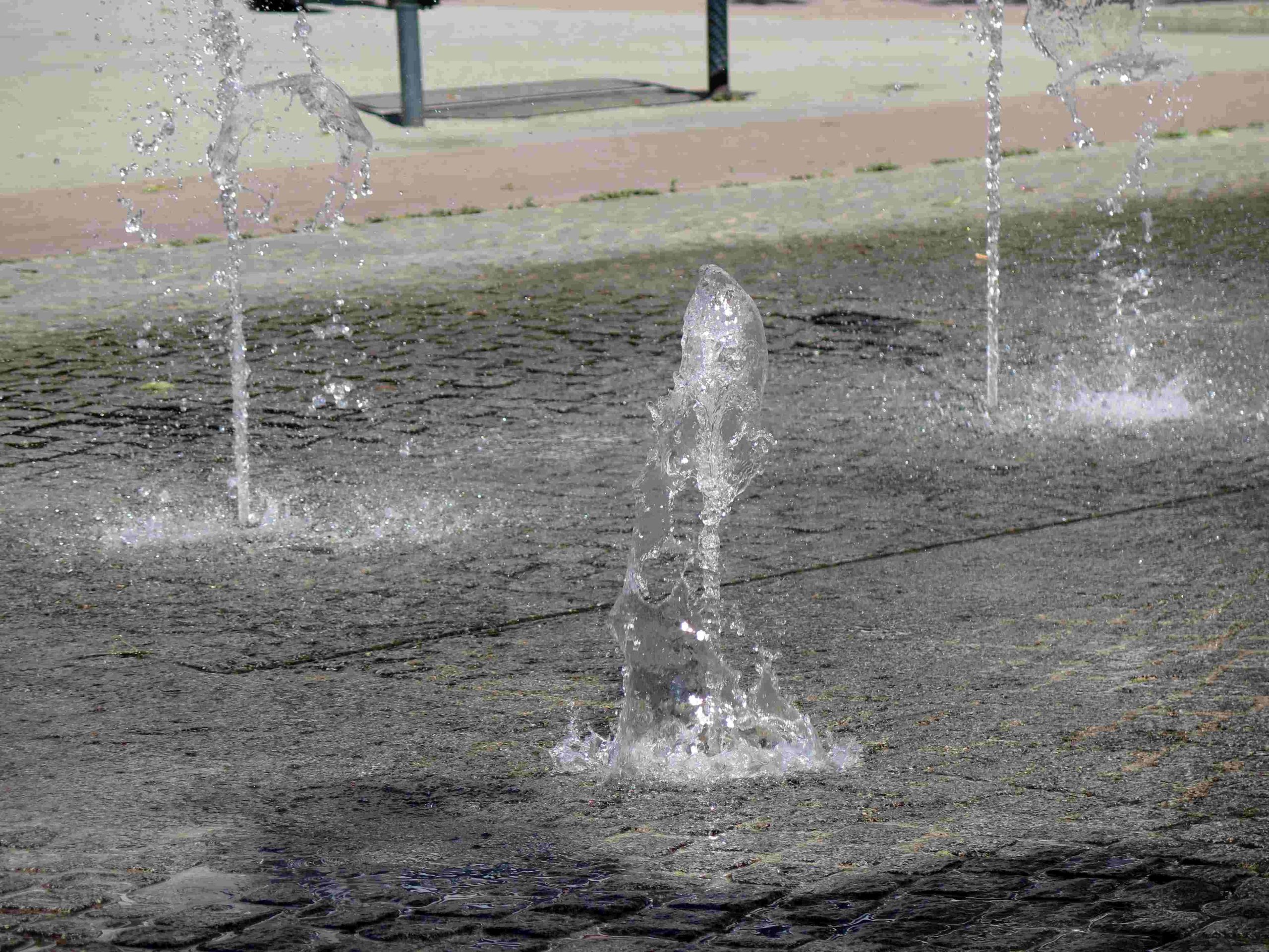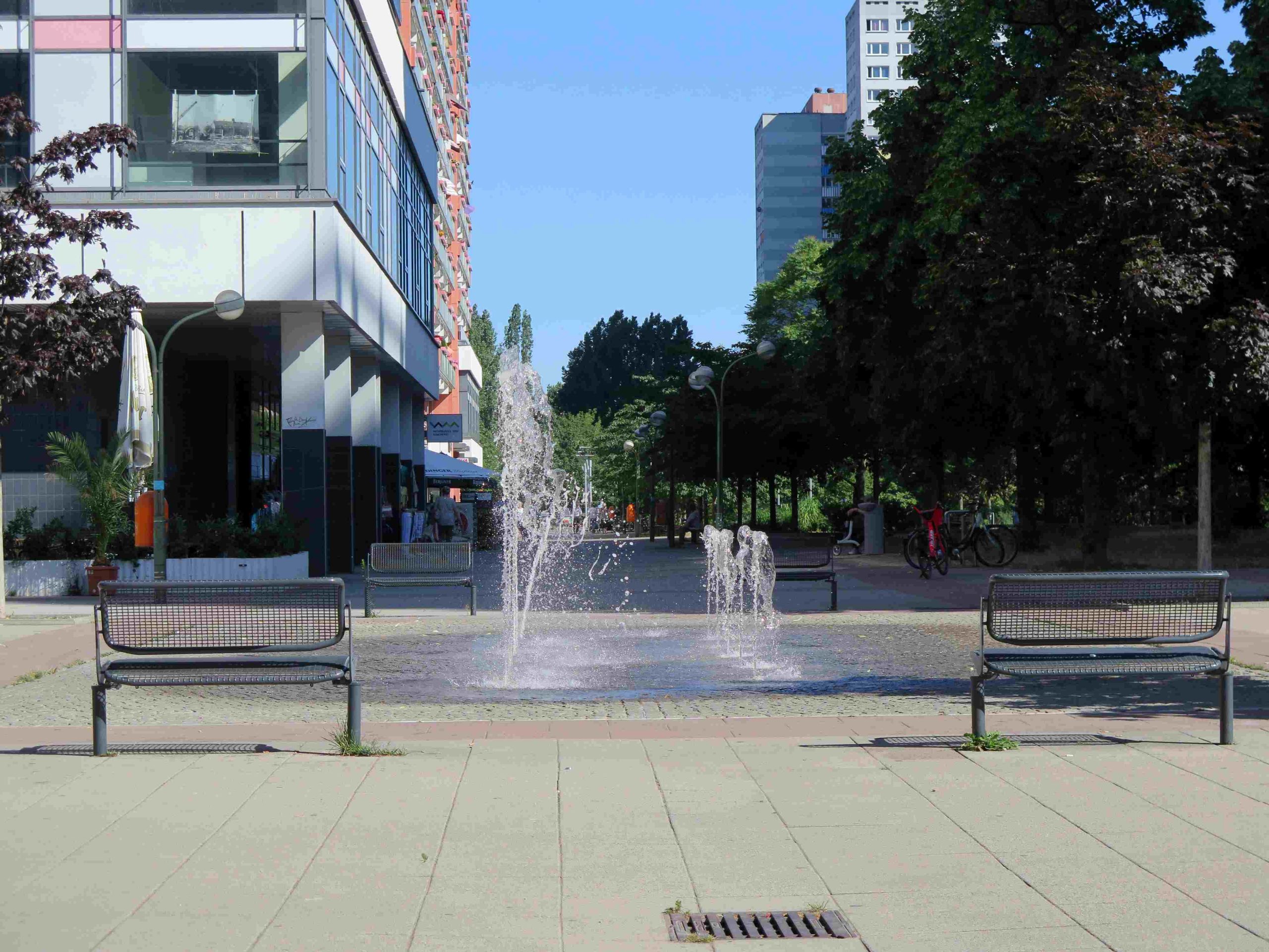 Zweireihiger Fontänenbrunnen. Auf dem Anton-Saefkow-Platz im Bereich nördlich des ehemaligen Kaufhauses befindet sich eine ca. 14,0 x 8,0 Meter große mit Pflastersteinen versehene Fläche, in deren Zentrum sich zwei Reihen mit fünf bzw. sechs, versetzt zueinander liegenden, elektronisch steuerbaren Wasserdüsen befinden. Die Wasserstrahlen steigen senkrecht in die Höhe, wobei die Strahlenhöhe in den beiden Reihen jeweils unterschiedlich ist, der Höhenwechsel wird durch eine elektronische Steuerung geregelt. Um die rechteckige Wasserspiel-Fläche sind Bänke aufgestellt, die vier Ecken sind mit jeweils einem Ahornbaum bepflanzt (Nicola Vösgen).