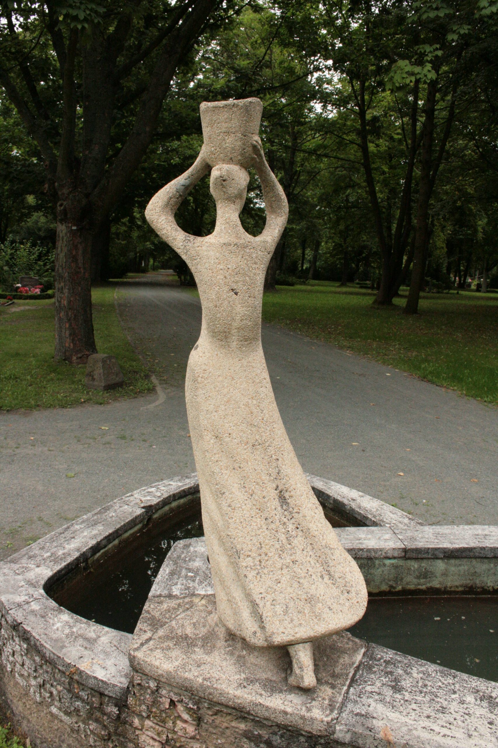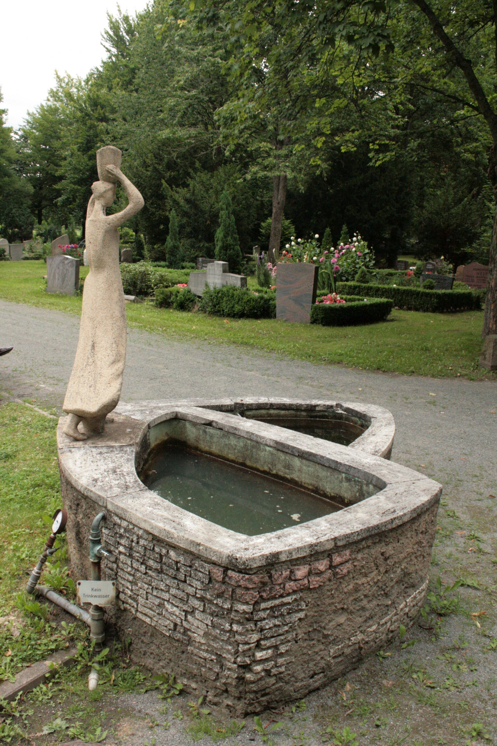 1956-1957 von Katharina Szelinski-Singer für den 1949 angelegten Friedhof geschaffen. Er befindet sich in der Abteilung 30 an der Kreuzung zur Abteilung 31 westlich der Trauerhalle (Jörg Kuhn).