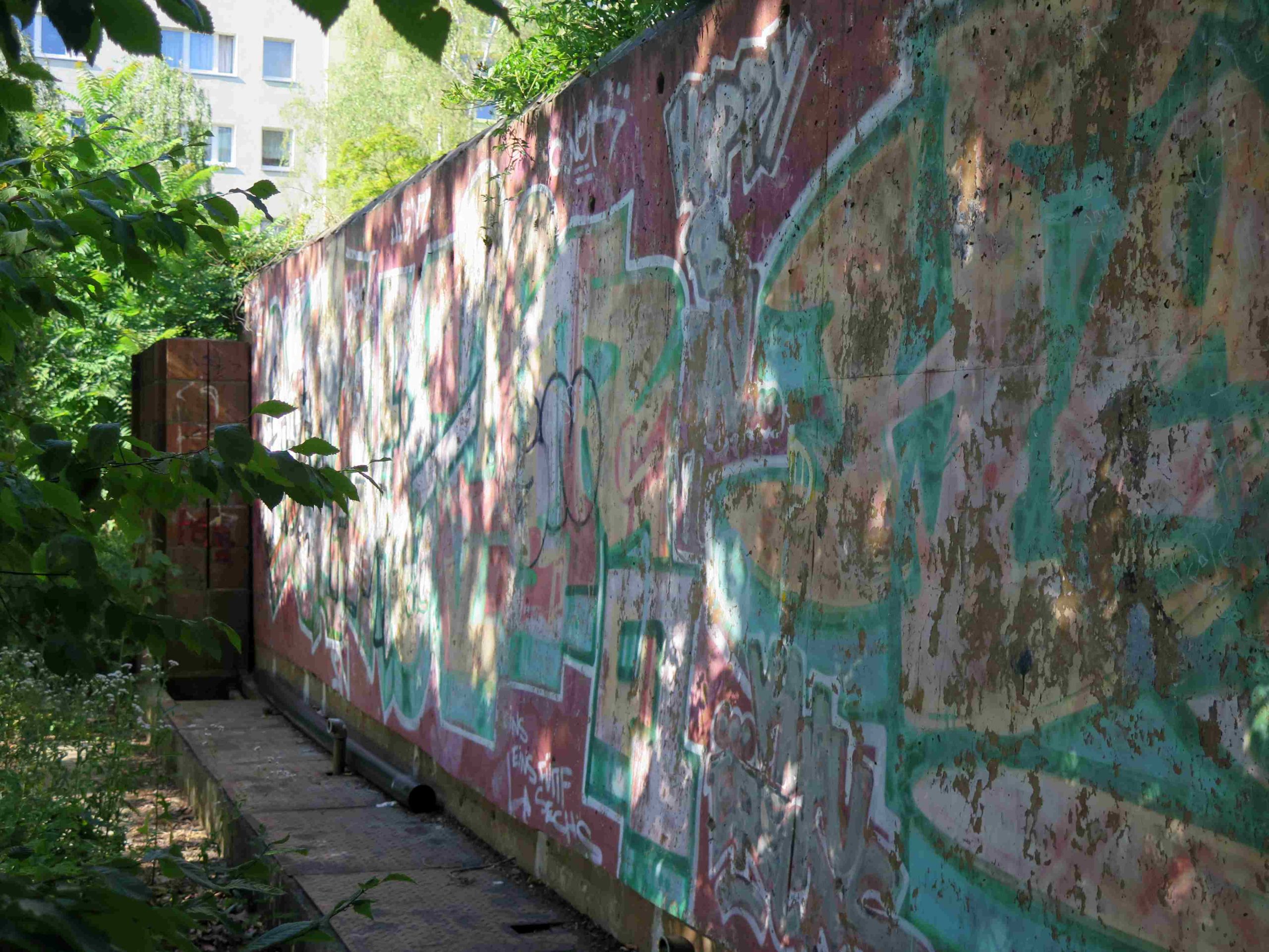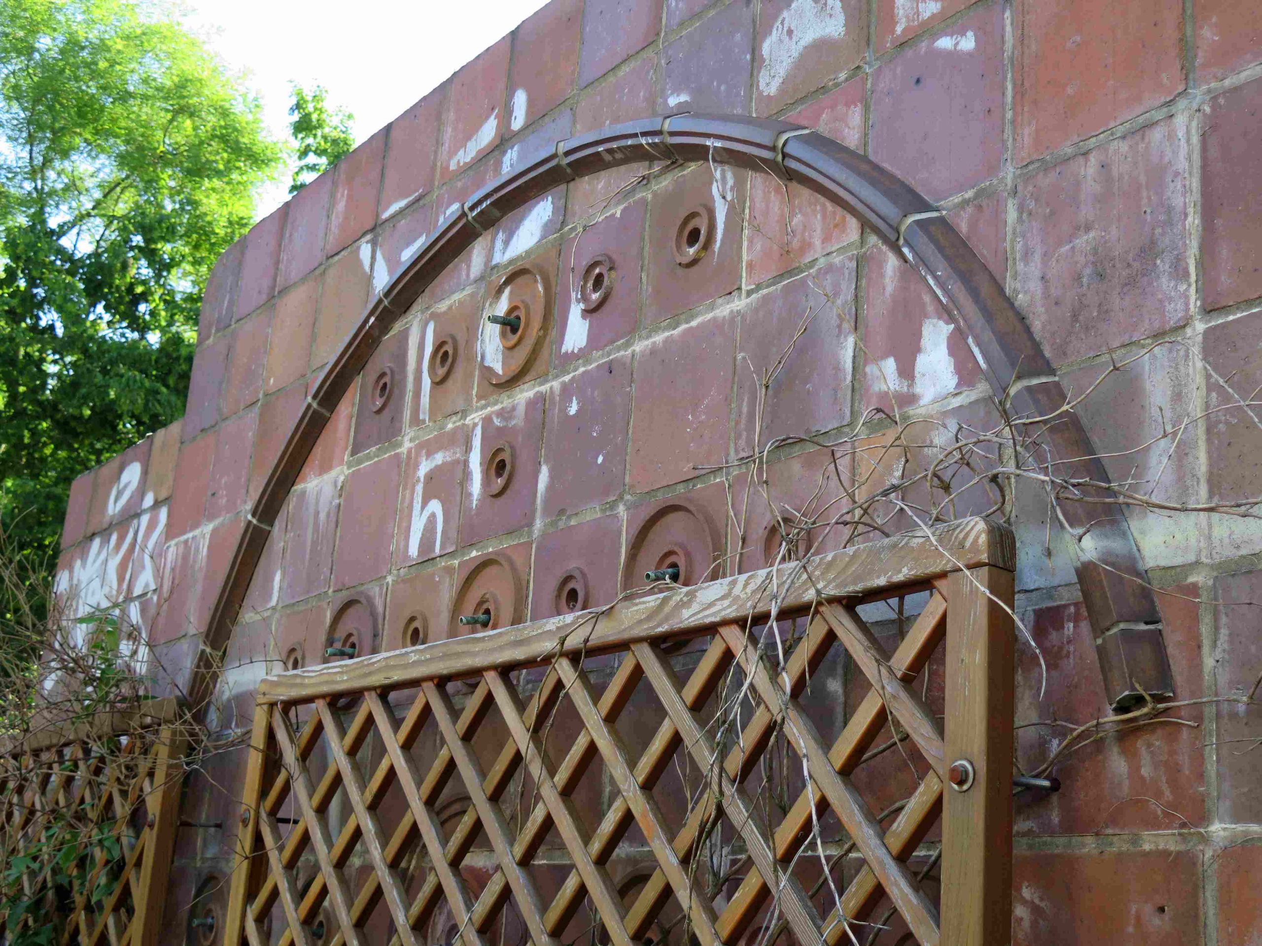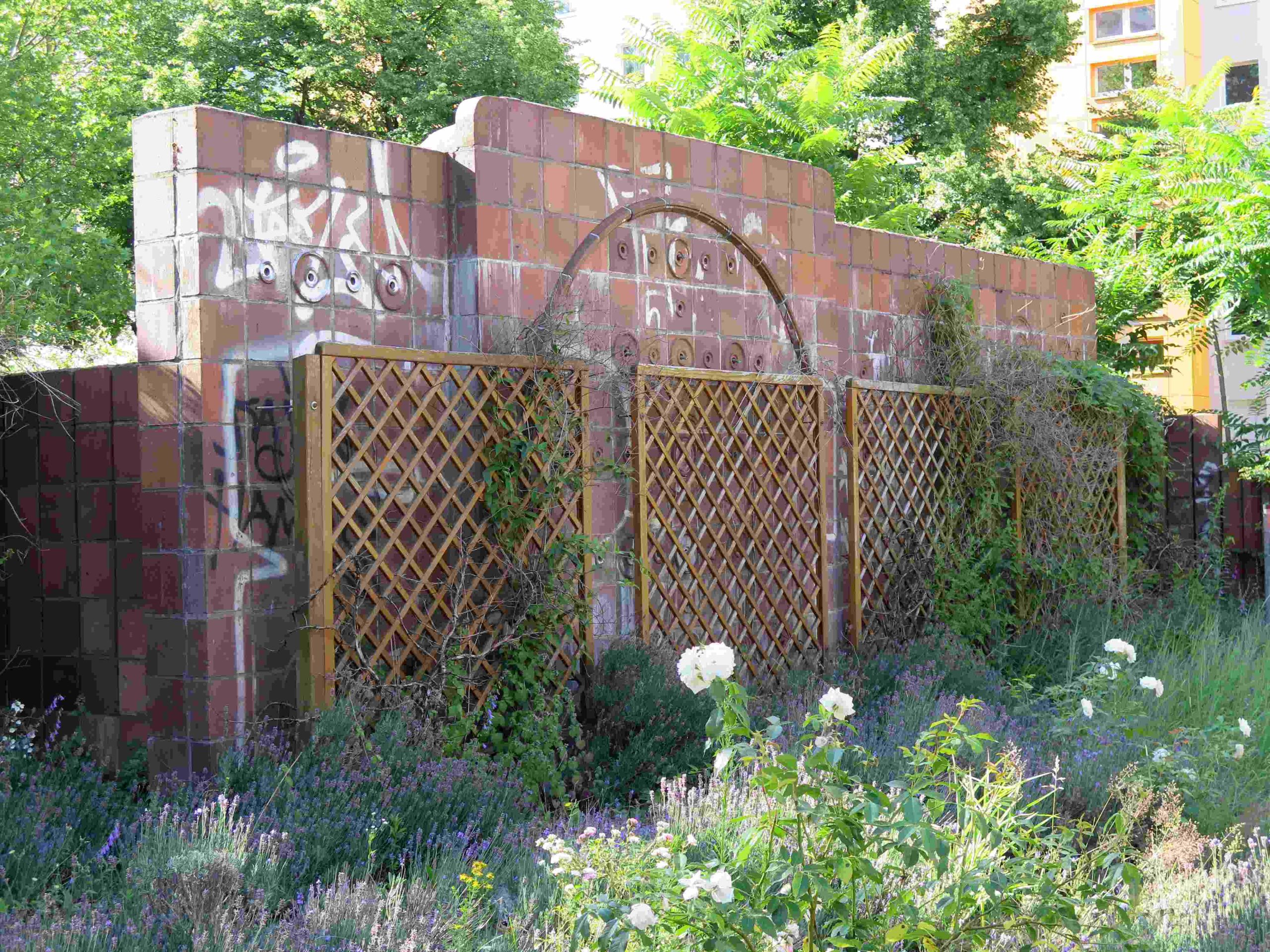 1984 oder 1989 errichtet. 2007 stillgelegt. 2010 Errichtung eines Rankenspaliers vor dem Wandbrunnen. Der Keramiker Jürgen Karnopp hat die Wasserwand gestaltet. In der Literatur werden als Datierung die Jahre 1984 oder 1989 genannt. Es konnten keine Unterlagen recherchiert werden, die die Errichtung in einem der beiden Jahre belegen könnten. Die Brunnenanlage hatte bei ihrer Errichtung eine wichtige Vermittlerfunktion im stadträumlichen Gefüge. Hier befand sich einer der Zugänge zum Boulevard auf dem Anton-Saefkow-Platz, einem viel beachteten Großbauprojekt in der DDR. Die beiden Brunnen im oberen Boulevardbereich (Kugelbrunnen von Karnopp und Findlingsbrunnen von Lothar Scholz) sind beide 1984 in Betrieb genommen worden. Die Wasserwand hatte zudem neben ihrer ästhetischen Funktion auch die Aufgabe, den fußläufigen Zugang zum Platz von der Anlieferzone zu der direkt dahinter liegenden früheren Kaufhalle abzugrenzen. Von daher erscheint es wahrscheinlicher, dass sie bereits 1984 errichtet wurde. Die ursprüngliche Anlage bestand aus einer ca. 20 Meter langen Klinkerwand, vor der sich über die gesamte Breite mehrere höhenabgestufe Wasserbecken befanden. Das Wasser trat aus den Wasseröffnungen in den Keramikformsteinen im südlichen Bereich in bogenförmigen Strahlen aus. Vor dem mittleren Brunnenbecken befand sich eine weitere niedrige Klinkerwand, aus der aus einer weiteren Reihe von Keramikformsteinen Wasser in ein davor liegendes Wasserbecken sprudelte. Die Fläche vor den Brunnenbecken war mit großen Steinplatten belegt. Die Anlage befand sich 1993 noch in einem guten Zustand. Da die Brunnentechnik an der Rückseite der Mauer jedoch leicht zugänglich war, wurde diese in den nächsten Jahren zunehmend zerstört. Der Wasseranschluss wurde deshalb um 2007 abgebaut. Um 2009 war die Wasserwand so stark beschädigt, dass eine Wiederherstellung nicht mehr möglich schien. Im Rahmen der Maßnahmen des Programms Stadtumbau Ost sind 2010 die drei Brunnenbecken abgetragen und ein hölzernes Rankgitter vor der Wand angebracht worden. Die Umbauarbeiten begannen im Juli 2010 und waren im Oktober 2010 abgeschlossen. Im Spätherbst 2010 wurden zahlreiche Rosen, Kletterpflanzen und Stauden gepflanzt und Bänke aufgestellt (vgl. https://www.stadtentwicklung.berlin.de/staedtebau/foerderprogramme/stadtumbau/Anton-Saefkow-Platz-Zugang-Karl-Lade-Strass.5686.0.html abgerufen am 21.09-2019). In diesem Zusammenhang ist die ehemalige Treppe vor der Brunnenwand zu einer Rampe umgebaut und analog zum gesamten Platz neu gepflastert worden (Nicola Vösgen).