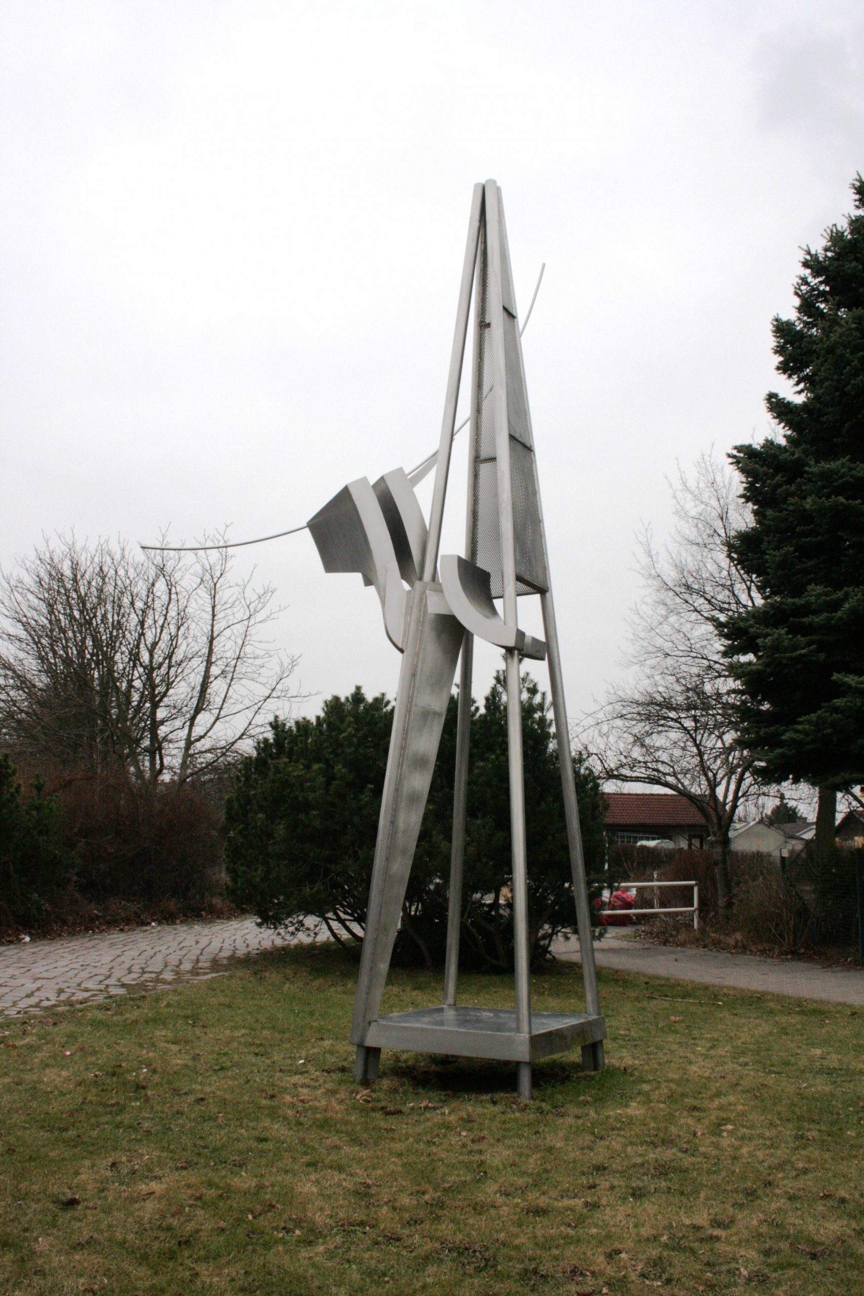 „Geometrisches Edelstahl-Objekt, das Formen wie Obelisk, Pyramide, Kegel collagehaft verbindet und als Richtungsweiser dient“ (Endlich/Wurlitzer, 1990, S. 65). Das Werk gibt in abstrakter Form eine barocke Gartenpyramide, wie sie zum Schutz von Broderieparterre-Rahmen-Bäumchen vorkommen, wieder und weist mit den vegetabilen Auslegern als einem zusätzlichen Hinweis auf das Ziel hin, nämlich den Eingang zum Britzer Garten (Jörg Kuhn, Susanne Kähler).