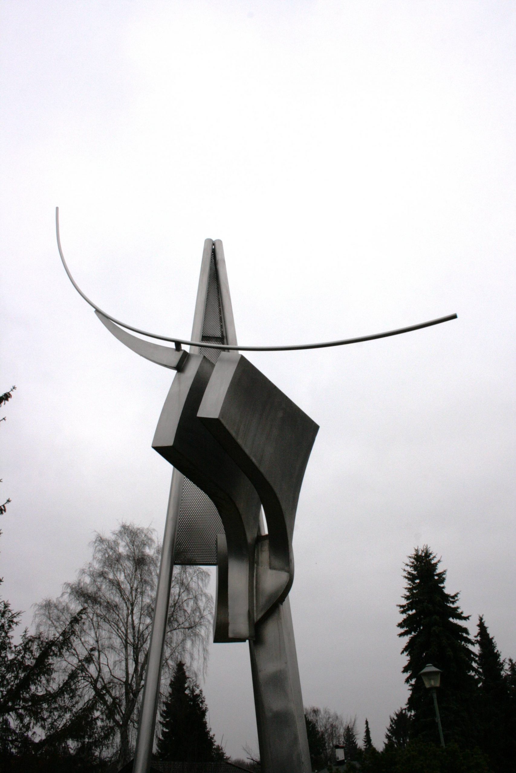 „Geometrisches Edelstahl-Objekt, das Formen wie Obelisk, Pyramide, Kegel collagehaft verbindet und als Richtungsweiser dient“ (Endlich/Wurlitzer, 1990, S. 65). Das Werk gibt in abstrakter Form eine barocke Gartenpyramide, wie sie zum Schutz von Broderieparterre-Rahmen-Bäumchen vorkommen, wieder und weist mit den vegetabilen Auslegern als einem zusätzlichen Hinweis auf das Ziel hin, nämlich den Eingang zum Britzer Garten (Jörg Kuhn, Susanne Kähler).