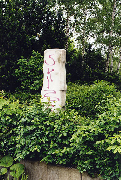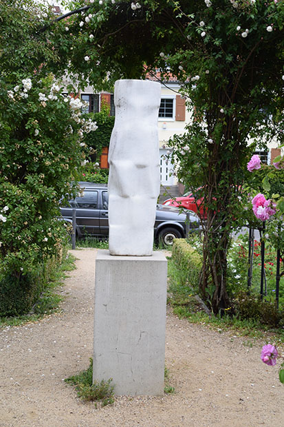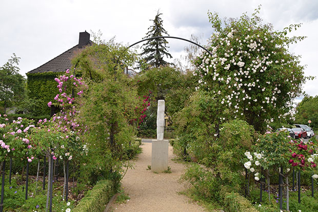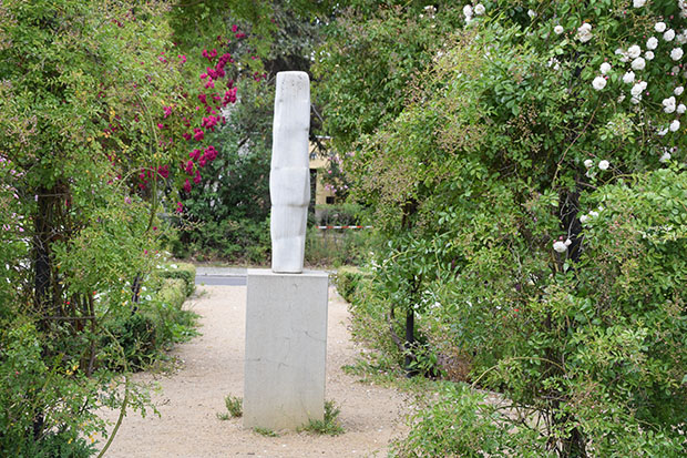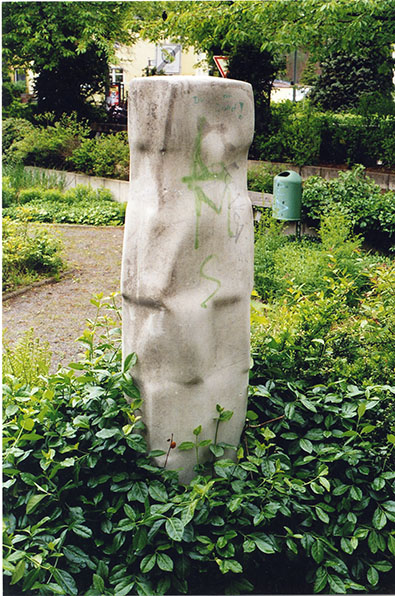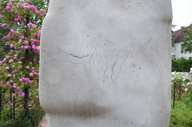 Das Objekt ist zentral am Kopfende des Rosengartens umgeben von Rosenbögen platziert. Die Stele aus weißem Marmor, ist gänzlich in abstrakten Formen gehalten. Die Oberfläche ist geglättet aber durch amorphe Strukturen, die wie Ausbeulungen und Knicke wirken, hat man den Eindruck, es befände sich eine menschliche Figur innerhalb einer Hülle. Durch die Bezeichnung „Große Stehende“ wird suggeriert, dass es sich um eine menschliche Figur handeln müsste (Susanne Kähler, Jörg Kuhn).