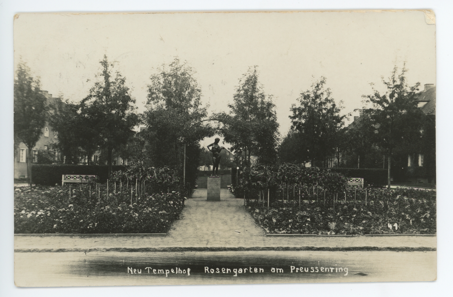 Der Rosengarten, an dessen Kopfseite heute die „Große Stehende“ zentral platziert ist, wurde 1926 von Rudolf Fischer (1883 – 1942) gestaltet. Fischer war ab 1913 Gartendirektor der gemeinnützigen Tempelhoferfeld Heimstätten-Gesellschaft. Die Gesellschaft verpflichtete sich zum Bau von Einfamilienhäusern mit Gärten für ehemalige Kriegsteilnehmer. Dadurch entstand die ab den 50er Jahren in Zentralbauweise erweiterte und bis heute erhaltene Siedlung. Diese war u.a. strukturiert durch den Parkring, der an den Enden mit dem Rumeyplan und dem Wolffring verbunden ist. Der Rosengarten, der die Gestaltung, der Siedlung vollendete, bildet im Zusammenspiel mit den bepflanzten Vorgärten der umliegenden Häuser eine geschlossene Fläche, die von Gartenmauern mit zierenden Putti begrenzt wird. Diese sind zum Teil noch heute erhalten. Fischer legte den Garten in klassischer Grundform mit Wegekreuz, Beetrosen und Rosenhochstämmchen an. Die mit Rosenbögen betonte Mitte des Gartens zierte seit 1931 Ernst Seegers (1868 – 1981) Bronze-Bildwerk „Eva“. 2007 wurde der Parkring in die Denkmalliste Berlins eingetragen. Die Initiative Parkring e.V. initiierte mit dem Bezirksamt Tempelhof-Schöneberg, begleitet vom Landesdenkmalamt, die Wiederherstellung des Rosengartens. Anstelle der „Eva“ wurde die abstrakte Skulptur „Große Stehende“ von Hildegard Lutze (*1937) im Zentrum der Rosenbögen aufgestellt (Layla Fetzer). (Vgl. H. Teske (2013): Text der Infotafel am Rosengarten/ beteiligt: Landesdenkmalamt Berlin, Fb. Gartendenkmalpflege und Archäologie und Bezirksamt Tempelhof-Schöneberg, Abt. Bauwesen.) Die Skulptur wurde 1990 in den Alten Park versetzt und vor 2019 in den Rosengarten im Parkring Neutempelhof transloziert (Freundliche Mitteilung durch Frau Delia Güssefeld an das BIB-Team im Herbst 2019).