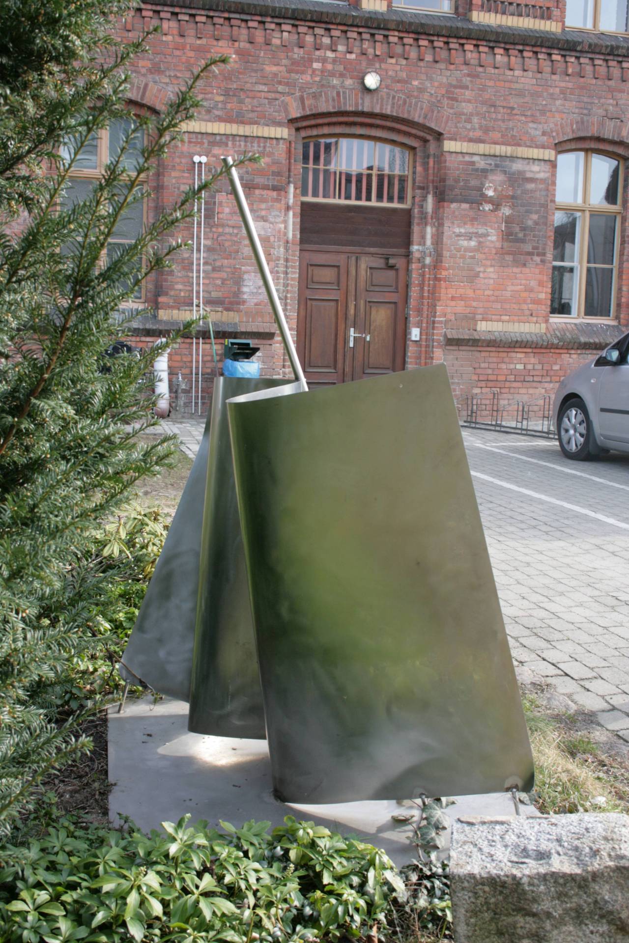 Auf rechteckiger Platte aus Edelstahl steht die Plastik „Welle mit Stab“, bestehend aus einem wellenförmig geformten, auf einer Kante aufgeständerten Stahlblech. Diagonal an die „Welle“ angelehnt und am oberen Ende verschraubt ist ein Stab, d. h. ein ebenfalls aus Edelstahl bestehendes Rohr. Die Deutung des abstrakten Objekts ist offen, Klangwellen, die aus dem Schlagen des Stabes gegen das stählerne Blech erzeugt werden könnten, werden assoziiert (Susanne Kähler, Jörg Kuhn).