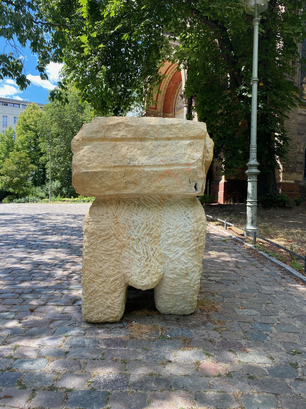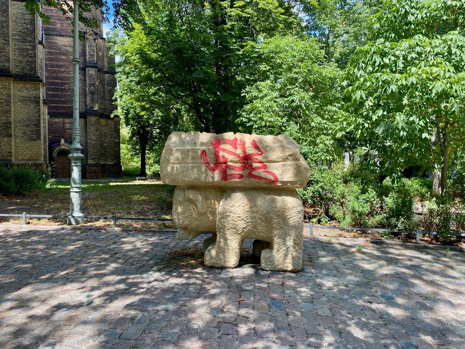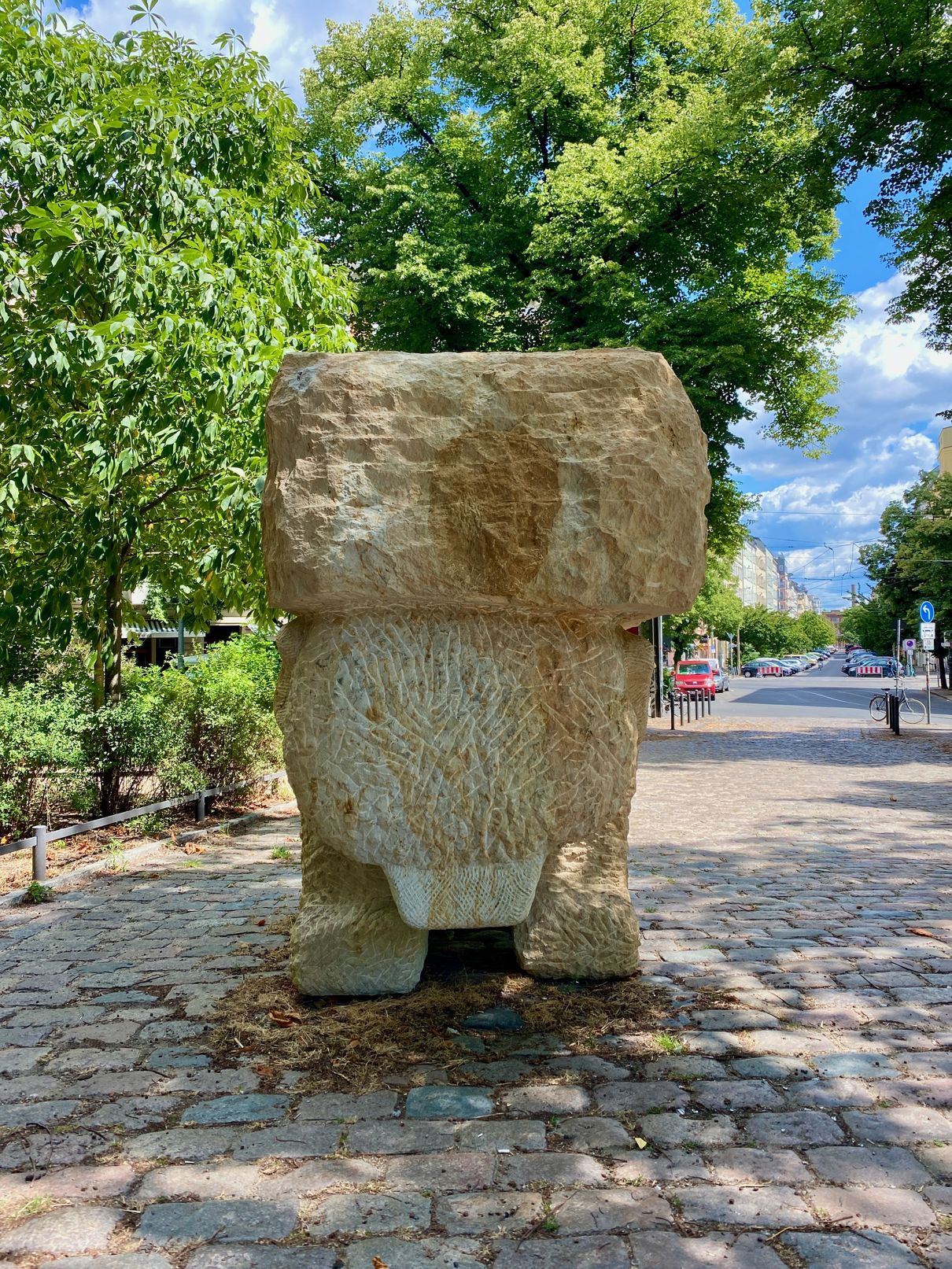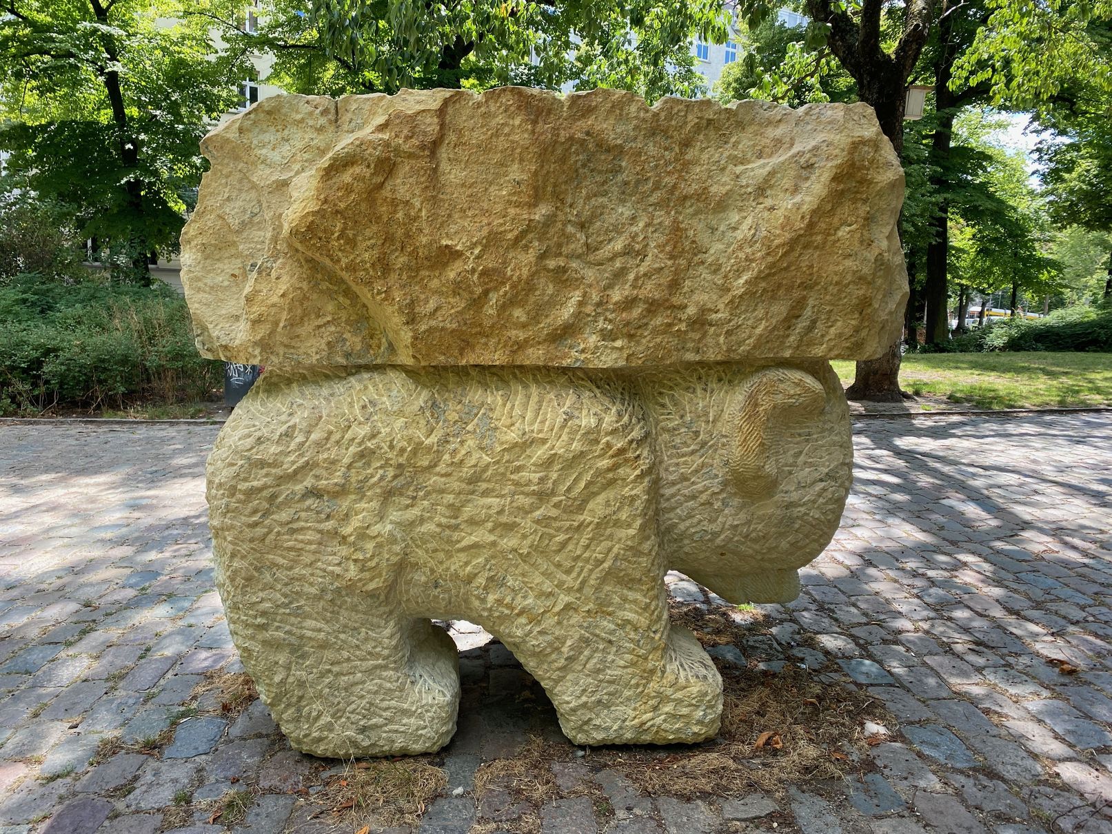 Der große Lastenbär ist eine Neufassung eines sehr viel kleineren Originals aus dem Jahr 2007. Dieser wurde im Rahmen der Ausstellung "Points of Resistance" im Frühjahr 2021 in der Zionskirche ausgestellt und erfreute sich großer Beliebtheit. Die Idee einer größeren Version des Bären für den öffentlichen Raum wurde innerhalb eines halben Jahres realisiert, sodass die Skulptur am 9. November 2021an der Zionskirche eingeweiht werden konnte. Der Standort wurde jedoch zunächst für zwei Jahre bewilligt und man hofft nun auf einen dauerhaften Erhalt der Skulptur im öffentlichen Raum (vgl. Kleiner von Wiese: Inauguration der monumentalen Sandsteinskulptur, 2021). (Pauline Ahrens)