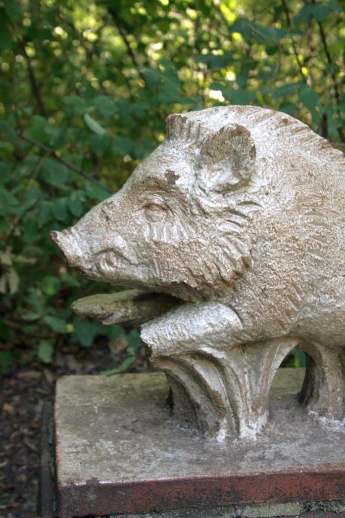 Auf einem leicht konisch sich nach oben verjüngenden, rechteckigen Unterbau, der mit vier Keramikplatten verkleidet ist, steht die naturnah formulierte, stark unterlebensgroße Darstellung eines durch einen stilisierten Wiesengrund eilenden Wildschweins (Eber, Keiler), das, vermutlich in jüngerer Zeit und nicht offiziell, silberfarben gefasst worden ist. Auf der Frontplatte des Sockels ist ein rechteckiges vertieftes Feld angelegt, in das ein richtungsweisender Metallpfeil eingesetzt ist (Jörg Kuhn).