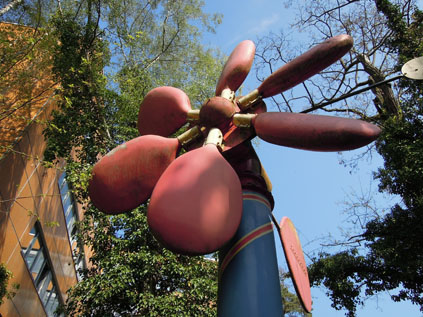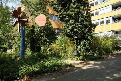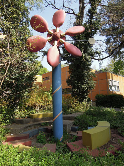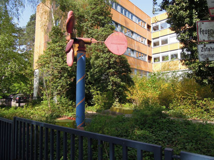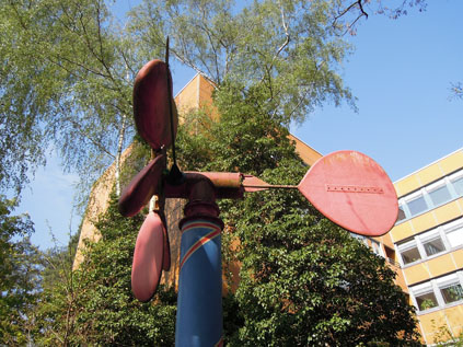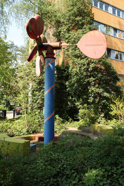 Das Kunstwerk steht im bepflanzten Vorgarten des Geländes. Vom Hauptweg zum Gebäude geht links, um eine Stufe erhöht, ein schmaler Weg ab, der zum Kunstwerk führt. Das „Windobjekt“ besteht aus einem blaugestrichenen Stahlrohrmast, an dem sich ein aufgemaltes rotgelbes Band emporwindet. An der Spitze des Mastes sind Bewegungsteile mit einem seitlichen und einem hinteren Windruder, und für windfreie Zeiten, ein Elektromotor aufgesetzt. Eine große vordere Scheibe, an der stilisierte rote Blütenblatt-Ornamente befestigt sind, lässt das Kunstwerk wie eine Blume erscheinen.