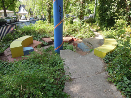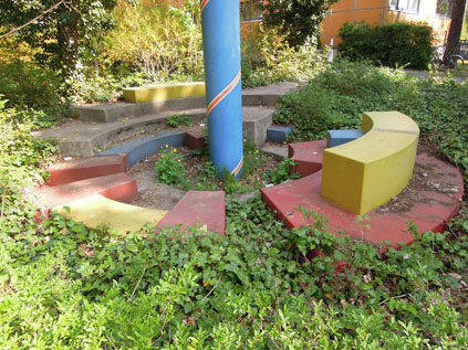 Das Objekt ist innerhalb einer Vertiefung im Zentrum reliefartig angeordneter Sitzstufen aufgestellt. Die derzeit stark ein- und überwachsenen Stufen, in verschiedenen Radien gerundet, sind teils massiv aus Sichtbeton, teils als farbige Hohlkörper in Rot, Gelb und Blau, vermutlich aus Faserzement, gestaltet. Der Zuweg besteht wie die Stufenanlage aus Beton (Jürgen Tomisch, Barbara Anna Lutz).