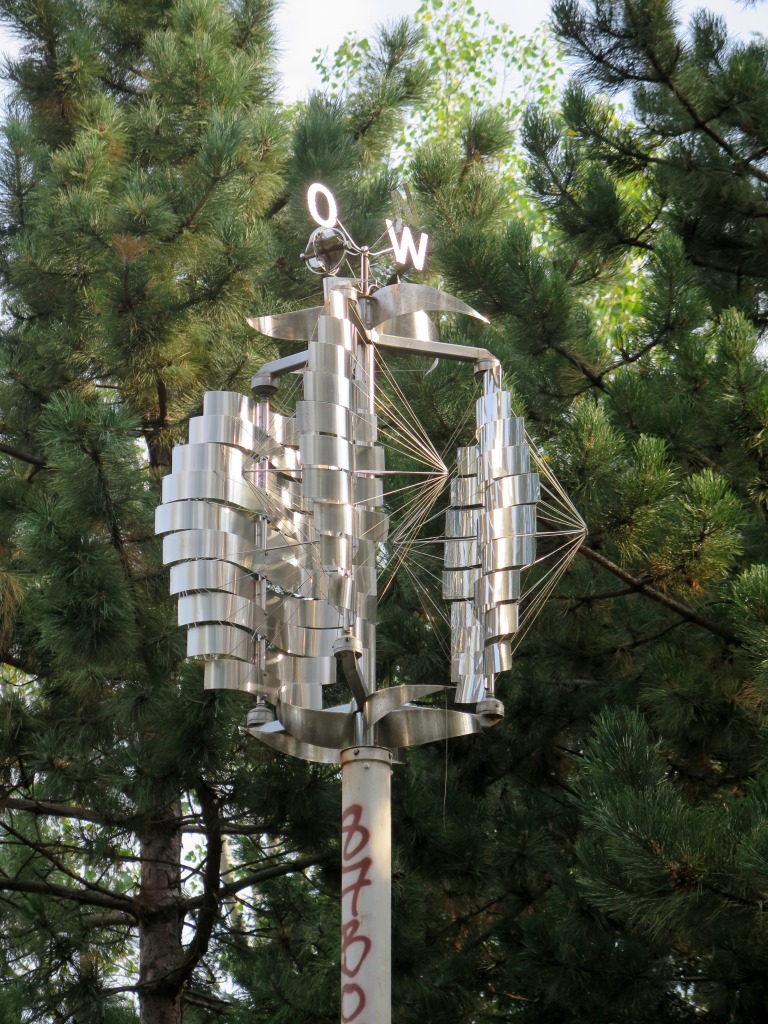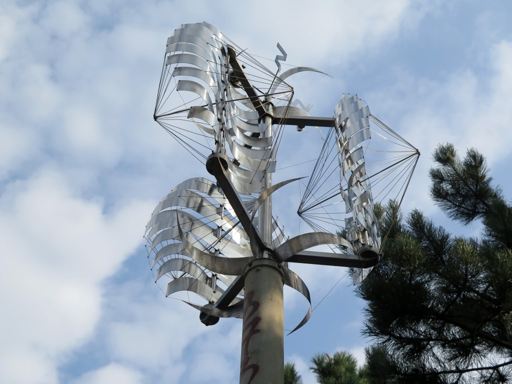 Auf einer hohen Säule ist eine abstrakt gestaltete Blüte montiert. Auf dem Hügel im nordöstlichen Bereich des Fennpfuhlparks befindet sich ein hoch auftragendes Windspiel. Über einem achteckigen Sockel mit umlaufender Holzbank erhebt sich eine runde Basis auf der eine Eisensäule befestigt ist. Diese trägt ein dreiteiliges abstraktes Gebilde, deren einzelne Teile aus miteinander verspannten Chromstreifen bestehen. Den oberen Abschluss bilden zwei an eine Windrose erinnernde Buchstaben „O“ und „W“. Bei zwei Begehungen vor Ort hat sich das Windspiel nicht bewegt, laut Information von Anwohnern würde es sich bei stärkerem Wind durchaus noch bewegen. Auf einer Metalltafel am Sockel steht die Information „WINDSPIEL / Goetz Dorl – DDR / Chromstahl 1990“. Auf einer weiteren Metalltafel am Fuß der Eisensäule „Metallgestaltung / Goetz Dorl / Bertricher Weg 3 / 13088 Berlin / 1989 nach Zerstörung 1994“ (Nicola Vösgen).