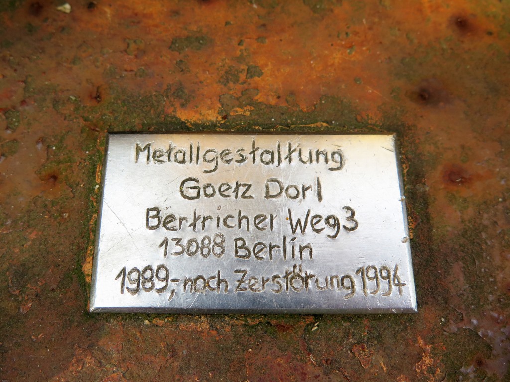 »Metallgestaltung / Goetz Dorl / Bertricher Weg 3 / 13088 Berlin / 1989,- nach Zerstörung 1994«