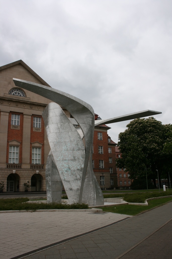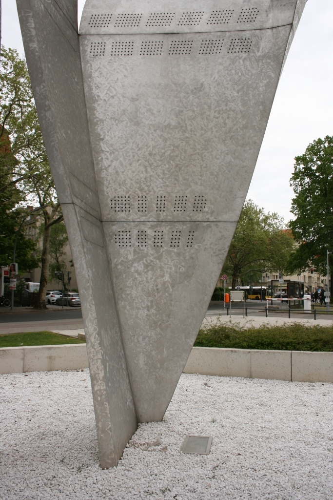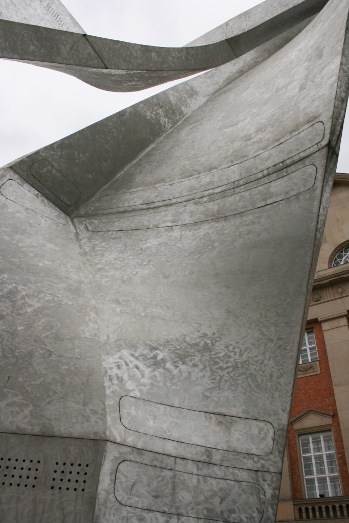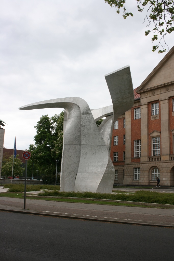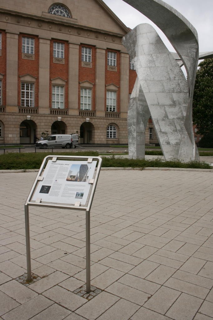 Mehrteilige Aluminium-Plastik mit deutlich erkennbaren Segmenten, die wiederum verschiedene Binnenstrukturen aufweisen, die das Thema des Kunstwerks „Digitalisierung“ als Hilfmittel von intelligenten Problemlösungen sichtbar machen. Bei der Berliner Plastik „verbindet sich das dreiteilige Basement im Verlauf der Drehung nach oben zweimal, um dann in zwei Flügelspitzen mit einer Spannweite von rund acht Metern zu enden. Rund 5.000 animierte LEDs symbolisieren spektakulär das Thema Digitalisierung“. Auf der Außenanlage des ‚Wing‘ befinden sich vier Hochbeete. Diese symbolisieren die ‚Wings'“ die vor den Siemens-Standorten Berlin, München, Erlangen und Mailand stehen und mit dem Berliner Kunstwerk inhaltlich und gestalterisch zusammen gehören. „Die Grünflächen haben die Form des durch Sonnenverlaufsstudien und CAD-Technik ermittelten Schattenwurfs des Hauptflügels der Skulptur um 12.00 Uhr am 01.10.1847 – dem Gründungsdatum von Siemens.“ Auch dass die Info-Stele „exakt 18,47 Meter vom Mittelpunkt der“ Plastik „errichtet wurde, verweist auf dieses Datum.“ (Zitate nach der Info-Tafel vor Ort) (Jörg Kuhn).