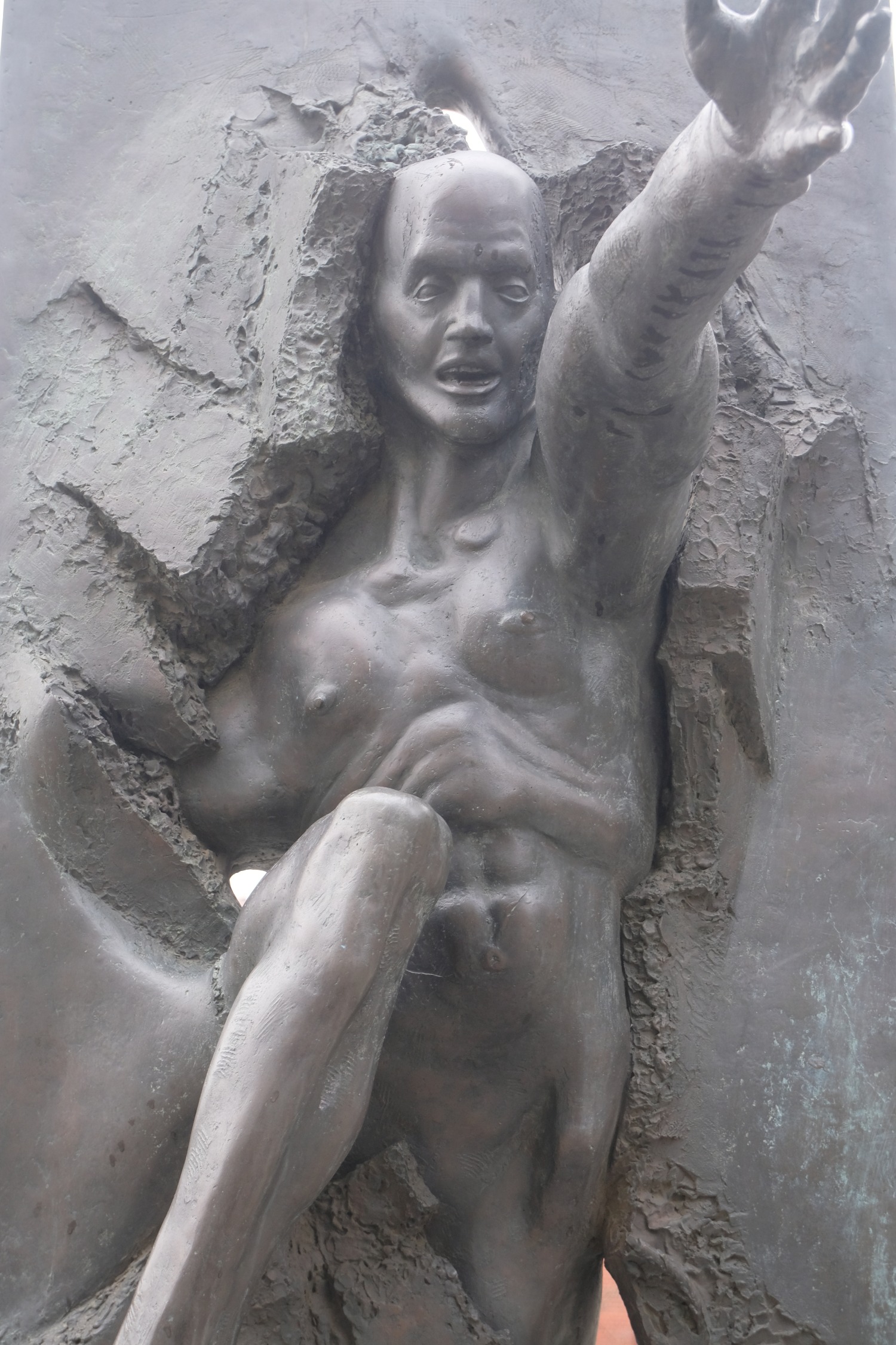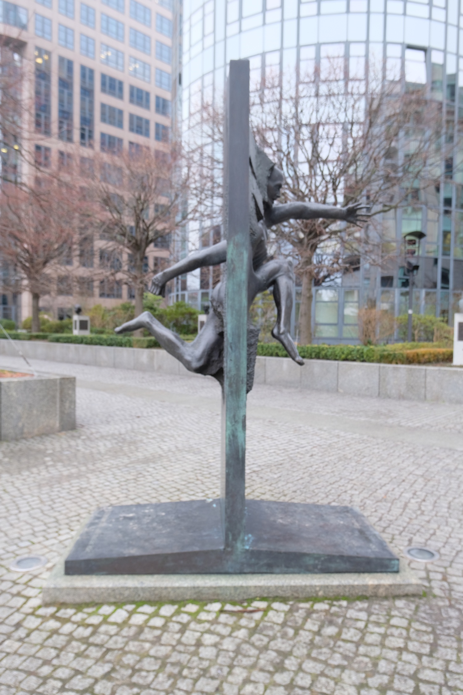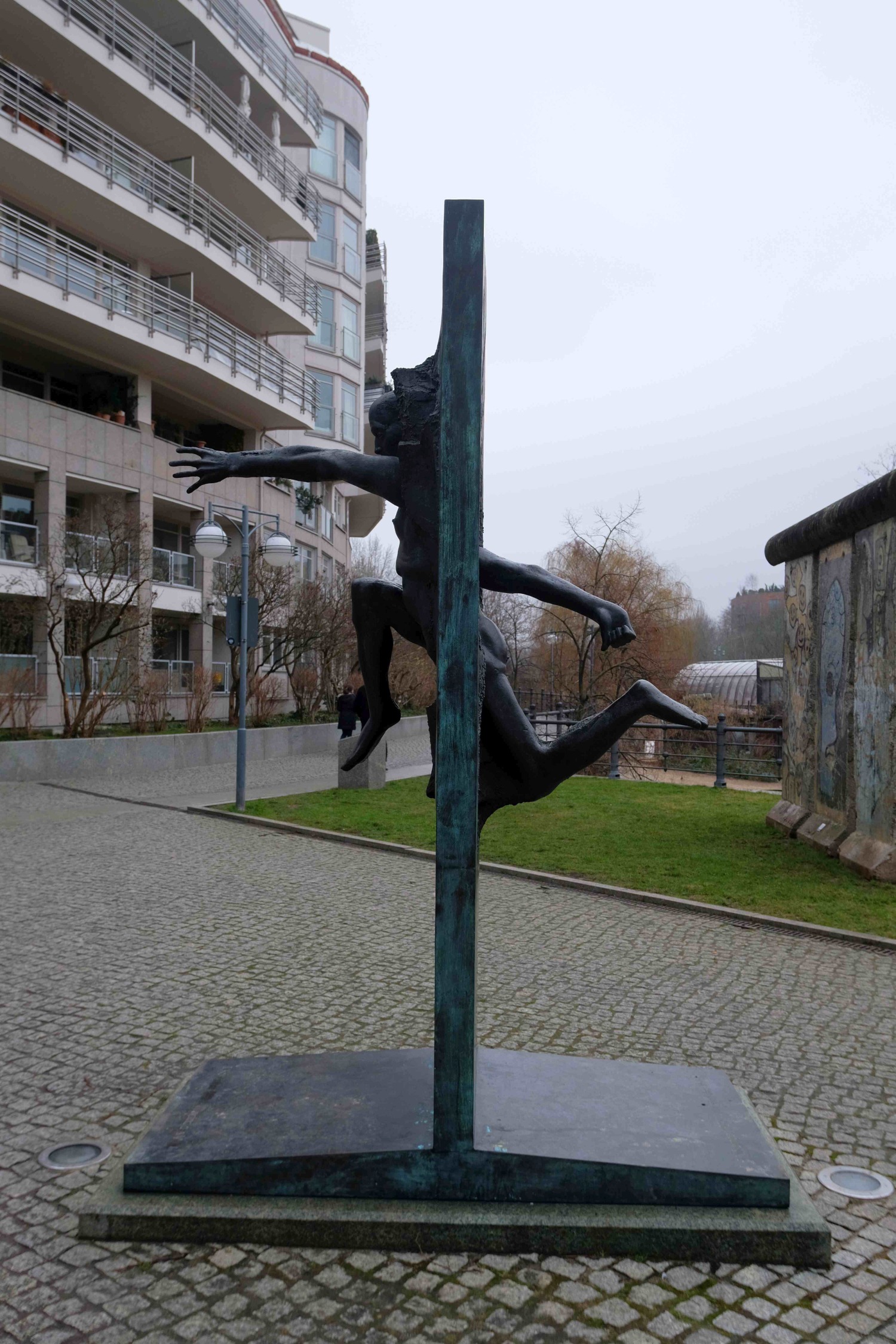 Freistehende Plastik, die einen unbekleideten Mann darstellt, der energisch durch einen Teil der Berliner Mauer springt. Sein rechtes Bein und sein linker Arm sind vorn und bereits auf der anderen Seite der Mauer. Sein Blick ist freudig und hoffnungsvoll, sowie sein Mund aufgerissen. Die Figur ist allansichtig und naturalistisch. Die Oberfläche wurde glatt gearbeitet.