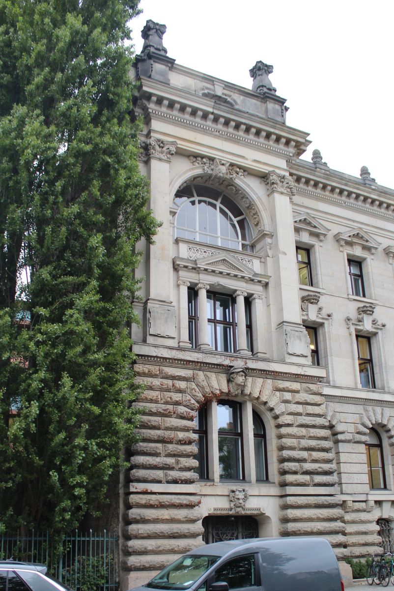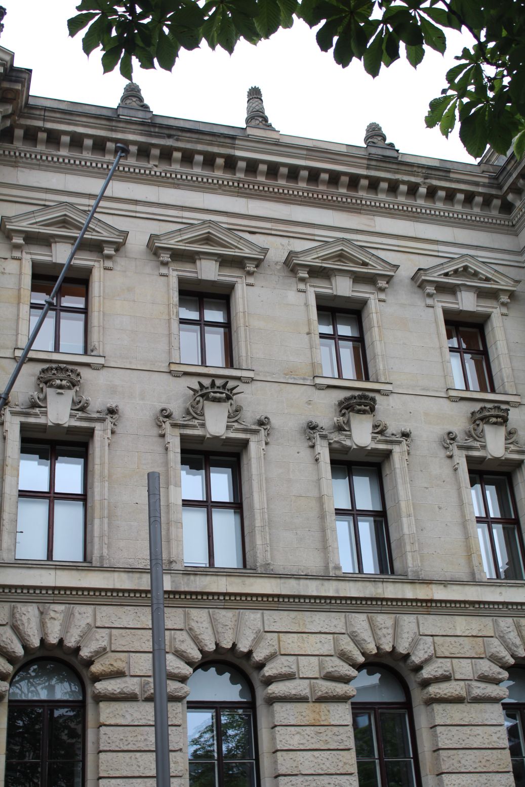 An den beiden Ecken des Gebäudes gibt es jeweils einen weiteren Risalit. Dieser hat ebenfalls ein kleineres eisernes Portal, was von einem Löwenkopf gekrönt ist. Oberhalb dessen befindet sich ein breites Rundbogenfenster, über dem sich der Kopf eines Mannes befindet. Die oberen Fenster werden von zwei Pilastern, die sich über zwei Geschosse erstrecken, miteinander verbunden. Über dem oberen Rundbogenfenster befindet sich eine fledermausartige Kreatur. Oberhalb wird die Fassade von weiteren bauplastischen Elementen geschmückt. So fällt die Ananas zwischen den Pinienzapfen auf der Attika ins Auge. Das Gebäude erinnert mit seiner Fassade an die des einige Jahre zuvor erbauten Reichstags von Paul Wallot. (Rieke Fender)
