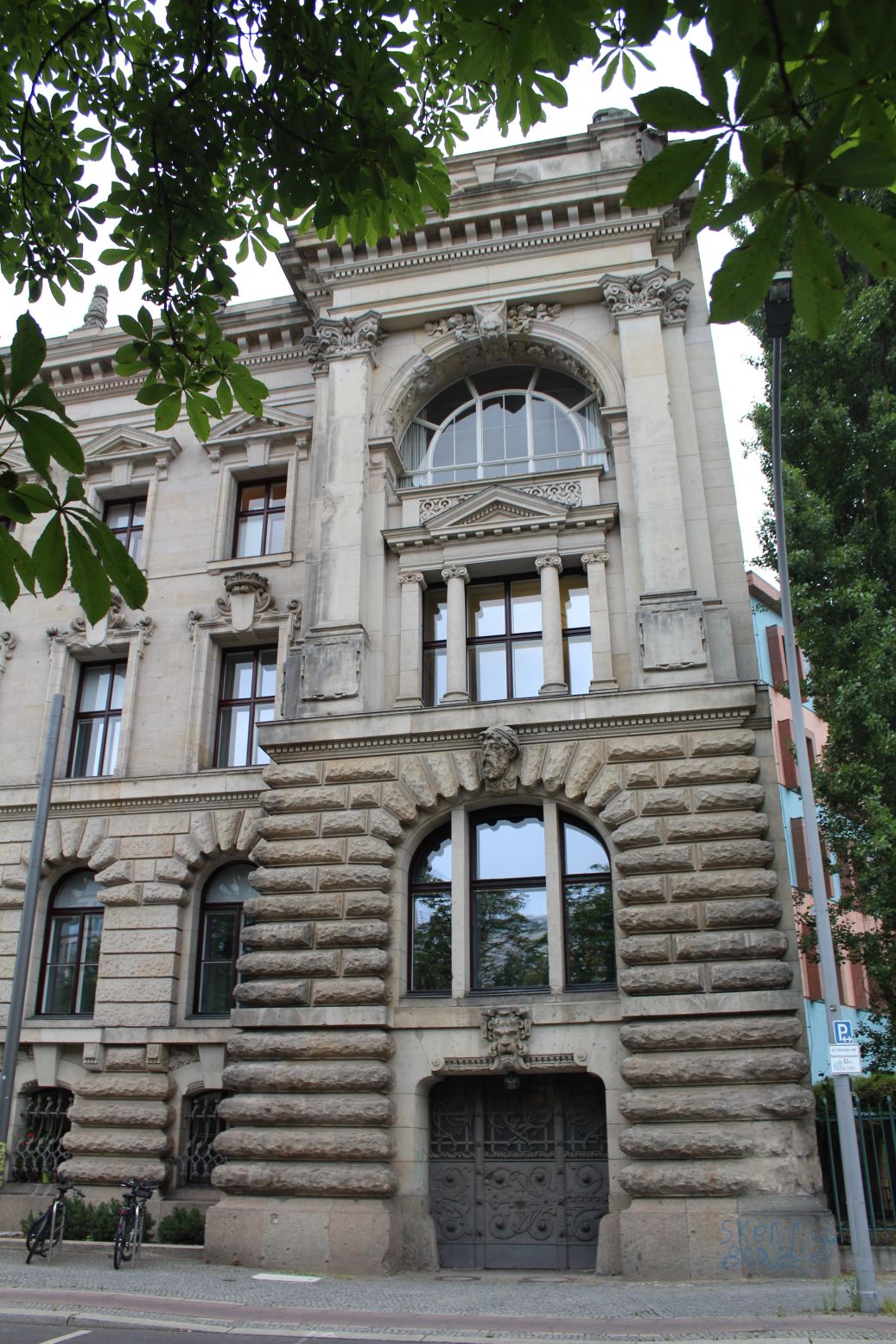 An den beiden Ecken des Gebäudes gibt es jeweils einen weiteren Risalit. Dieser hat ebenfalls ein kleineres eisernes Portal, was von einem Löwenkopf gekrönt ist. Oberhalb dessen befindet sich ein breites Rundbogenfenster, über dem sich der Kopf eines Mannes befindet. Die oberen Fenster werden von zwei Pilastern, die sich über zwei Geschosse erstrecken, miteinander verbunden. Über dem oberen Rundbogenfenster befindet sich eine fledermausartige Kreatur. Oberhalb wird die Fassade von weiteren bauplastischen Elementen geschmückt. So fällt die Ananas zwischen den Pinienzapfen auf der Attika ins Auge. Das Gebäude erinnert mit seiner Fassade an die des einige Jahre zuvor erbauten Reichstags von Paul Wallot. (Rieke Fender)