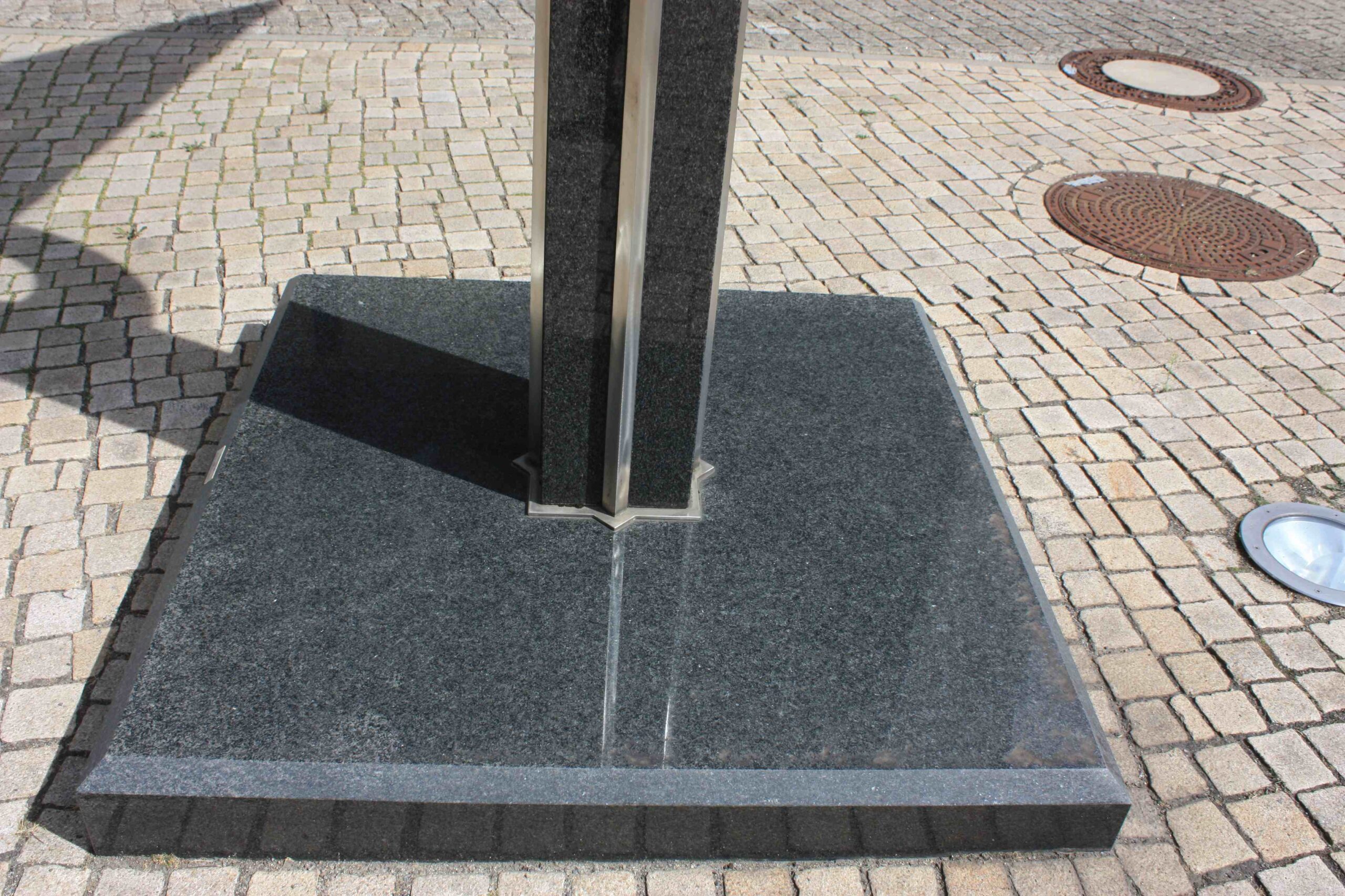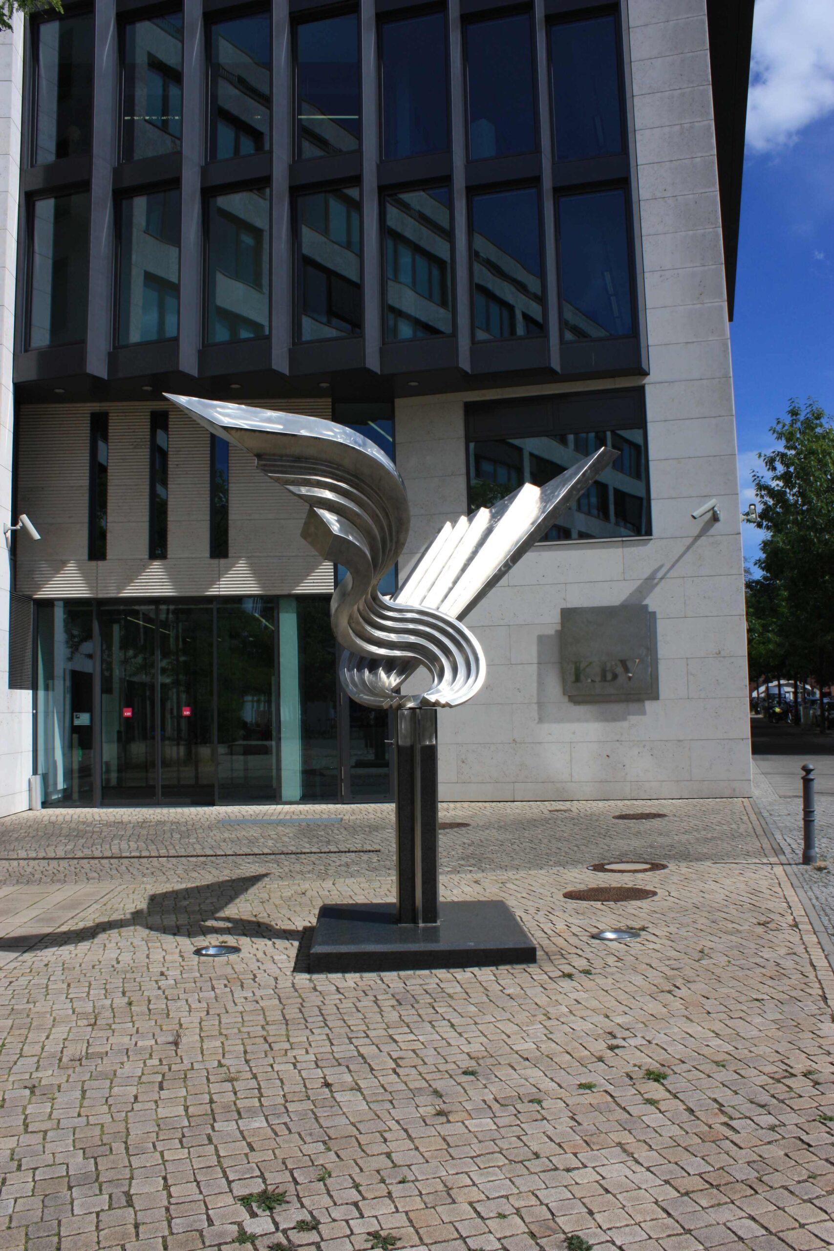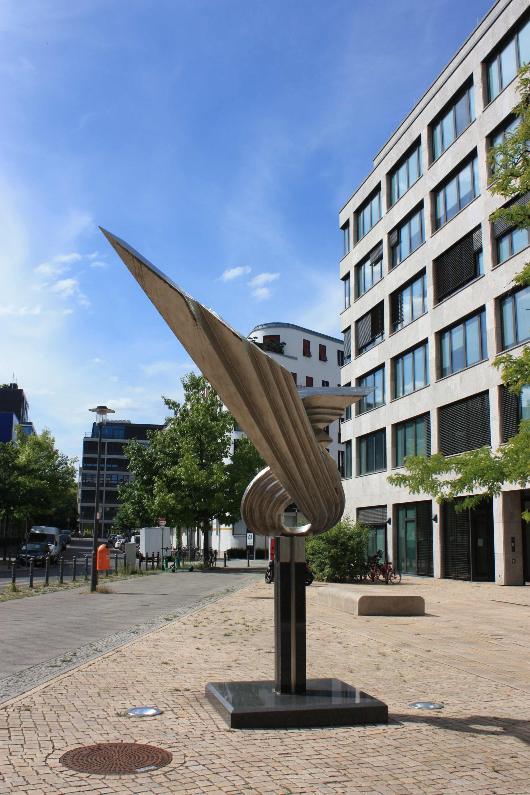 Abstrakte Plastik aus gebürstetem Edelstahl in Form eines doppelten Flügels. Die in sich gedrehten, diagonal abgestuften Flügel finden sich mittig in einer wogenförmigen Schlaufe zusammen. Die Flügel erzeugen durch ihre kunstvolle Drehung vielfältige Ansichtsseiten. Sie thronen auf einer Granitstele mit sternförmigem Grundriss, welche mittig auf einem flachen Sockel aus dem gleichen Material sitzt. Die schwarze Oberfläche ist glänzend poliert. Eine Verbindung zwischen den Flügeln und dem Sockel entsteht durch die Einfassung der Kanten der Stele mit Edelstahl. Das Material wird ebenfalls in der Einfassung der sternförmigen Grundfläche auf dem Granitsockel aufgegriffen. In der Gestaltung des Flügelobjekts liegt eine raumgreifende Dynamik (Layla Fetzer).