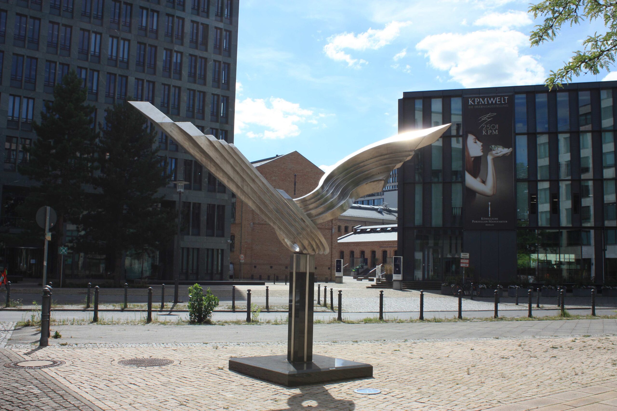 Die Kunstwerk wurde 1996 von Volkmar Haase gestaltet und in der Werkstatt des Stahlbildhauers Karl Menzen (1950-2020) ausgeführt. 2010 im Zuge der Neugestaltung des Herbert-Lewin-Platzes im KPM-Quartier aufgestellt.