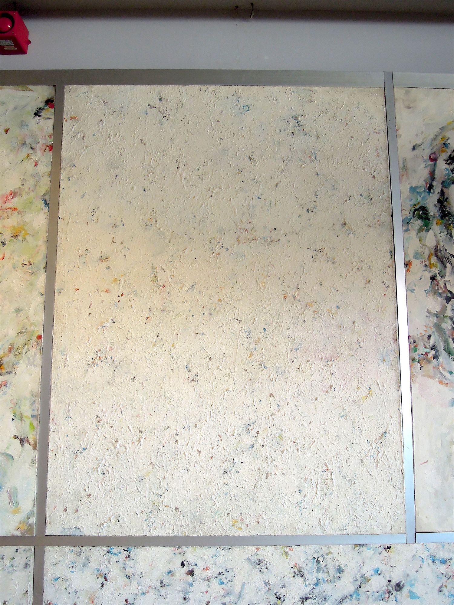 „Der Flughafen Tegel mit knapp 6 Millionen Passagieren jährlich wurde 1983-85 zum Ort für ein umfassendes Skulpturen- und Gemäldeprojekt zur Berliner Gegenwartskunst, finanziert aus dem zentralen Fonds »Kunst im Stadtraum«. Als Ergebnis eines offenen Wettbewerbs […] wurden 10 Werke innerhalb und außerhalb des Flughafengebäudes aufgestellt, die einen Querschnitt durch das stilistische Spektrum Berliner Bildhauerei darstellen; hinzu kam der Ankauf von Gemälden und Gouachen in den Innenräumen.“ (Endlich/Wurlitzer, 1990, S. 78-79) Wohl im Rahmen dieser Gemälde-Ankäufe kam auch der 1981-82 entstandene Gemäldezyklus Wolkensprache I zum Tegeler Flughafen. Das innerhalb der „Weißen Bilder“, die Manfred Henkel von 1975-1982 schuf, in der Reihe Wolkensprache entstandene Werk fand seinen Platz im Hauptgebäude, in der sogenannten Nebelhalle „oben auf der Empore“ (vgl. Staatliche Kunsthalle Berlin (Hrsg.), 1985, S. 23-27). Der Künstler sagte 1984 zur Platzierung des Gemäldezyklus‘: „Ich finde es sehr gut, wenn in einem öffentlichen Stadtraum, wie es der Flughafen ist, die Möglichkeit zur Meditation und zur Vertiefung besteht. Man hat auch versucht, mitten in die Stadt Kapellen zu bauen, man hat versucht, andere Ruhezonen des Verweilens zu schaffen, herrliche Anpflanzungen zum Beispiel, und so weiter. Ich finde das sehr, sehr wichtig, daß Kunst im Stadtraum zur Vertiefung anregt.“ (ebenda). Im Zuge der Deutschen Wiedervereinigung begannen 1989 die Planungen für den neuen Großflughafen Berlin Brandenburg, Tegel sollte nicht mehr weiter ausgebaut werden. Als der steigende Flugverkehr und die sich verzögernde Fertigstellung des Großflughafens schließlich doch eine Erweiterung Tegels erforderte, wurde die „Nebelhalle“ im Hauptgebäude durch die Stationierung von Check-in-Schaltern zum Terminal B ausgebaut. „Wolkensprache I“ wurde im Zuge dieser Maßnahmen in den frühen 1990er Jahren gesichert und eingelagert. Erst 2019, als die Abwicklung des Flughafens feststand, wurde das Gemälde – quasi für die Übergabe des Gebäudes – am derzeitigen Standort montiert. Der Gemäldezyklus war im Zusammenhang mit der Einlagerung restauriert worden (Zeitpunkt unbekannt). Der unter Denkmalschutz stehende Passagier-Flughafen Berlin Tegel (Tegel-Süd) „Otto-Lilienthal“ entstand ab 1969-1975 nach Plänen der Hamburger Architekten Meinhard von Gerkan, Volkwin Marg und Klaus Nickels. Der für seine kurzen Wege bekannte Flughafen wurde nach der Eröffnung des neuen Flughafens in Berlin-Schönefeld (BER) Ende Oktober 2020 stillgelegt und soll einer neuen Nutzung zugeführt werden. (Jürgen Tomisch, Barbara Anna Lutz)