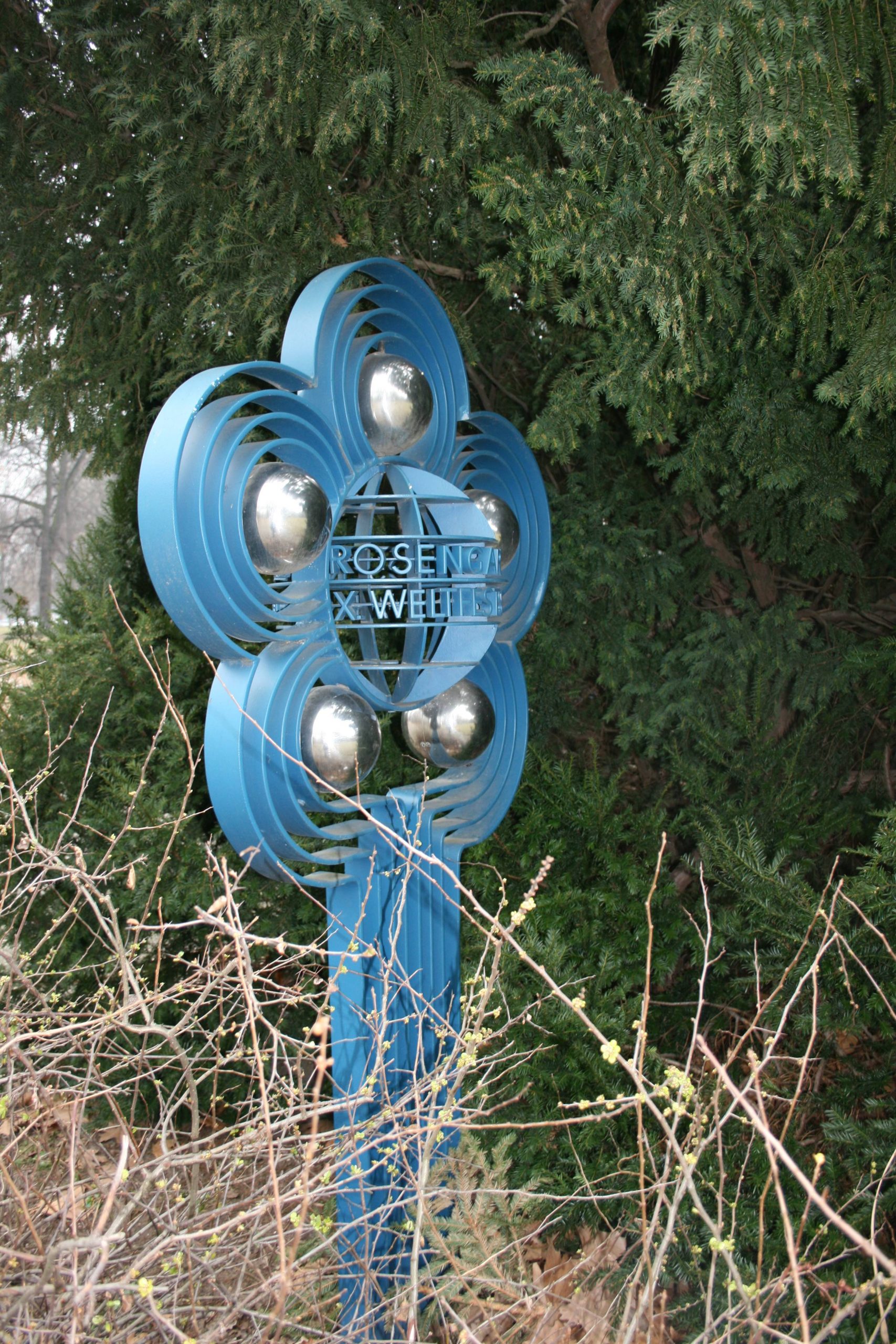 Es handelt sich bei dem Werk um die Darstellung einer stilisierten Blume aus blau gefassten Stahlbändern geformt. Um eine als Weltkugel gestaltete Mitte mit der Inschrift ROSENGARTEN / WELTFESTSPIELE sind fünf Blütenblätter gruppiert, in deren Mitte jeweils eine Kugel aus poliertem Edelstahl mit einem Durchmesser von 20 cm montiert ist. Sie ist auf einer Fundamentplatte aus Beton mit Schrauben fixiert (Susanne Kähler, Jörg Kuhn).