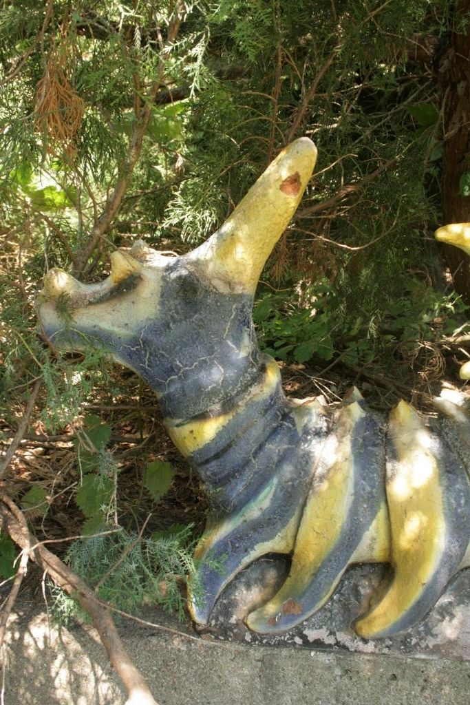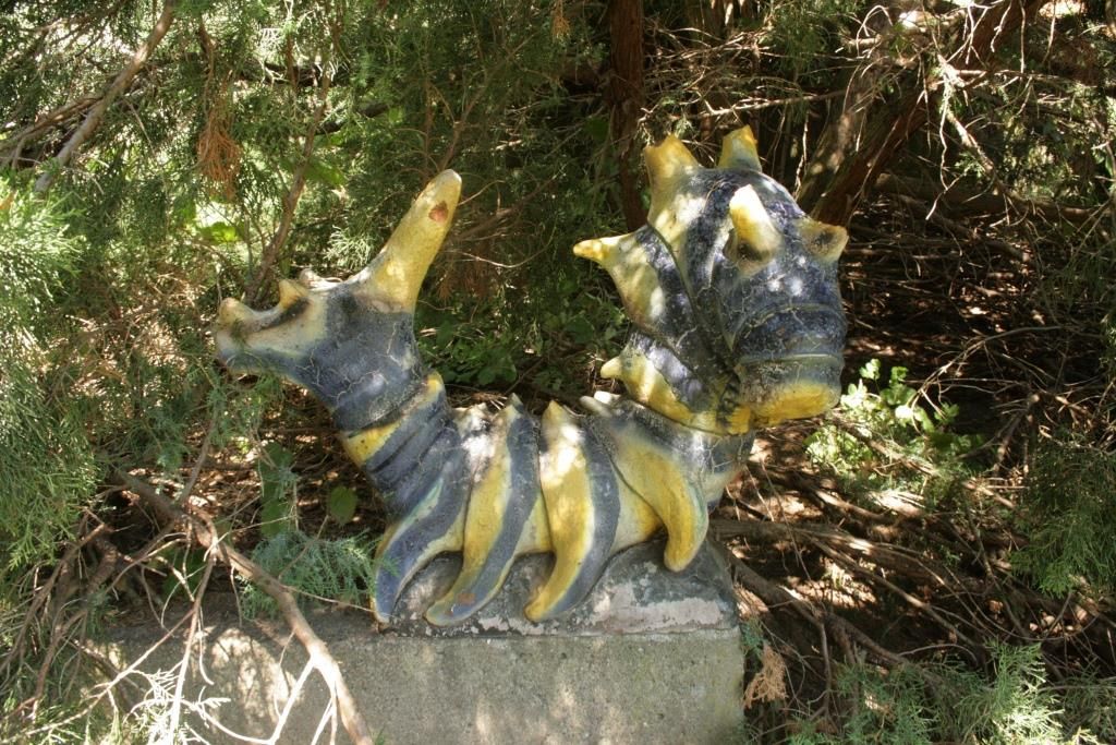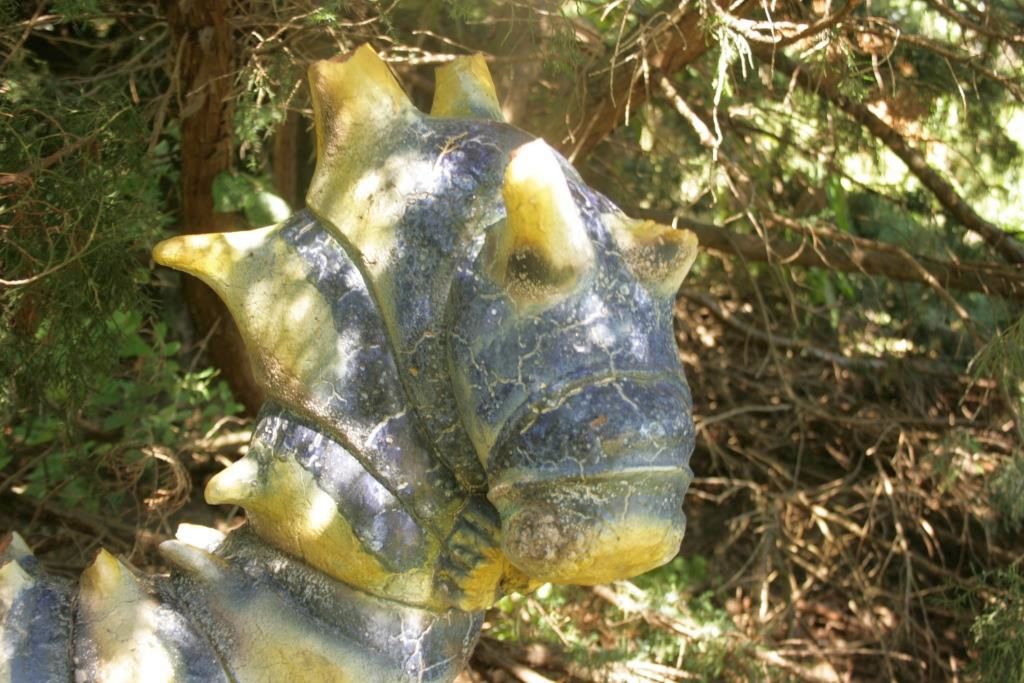 Überlebensgroße Darstellung einer Raupe aus der zoologischen Familie der Zahnspinner (Notodontidae). Die gewählten Farben – blau-gelb-creme in polychromer gestreifter Anordnung – scheinen aber eher der künstlerischen Fantasie Tilkes geschuldet zu sein, als der wissenschaftlich exakten Naturbeobachtung (Jörg Kuhn nach Heinrich Dathe, 1980).