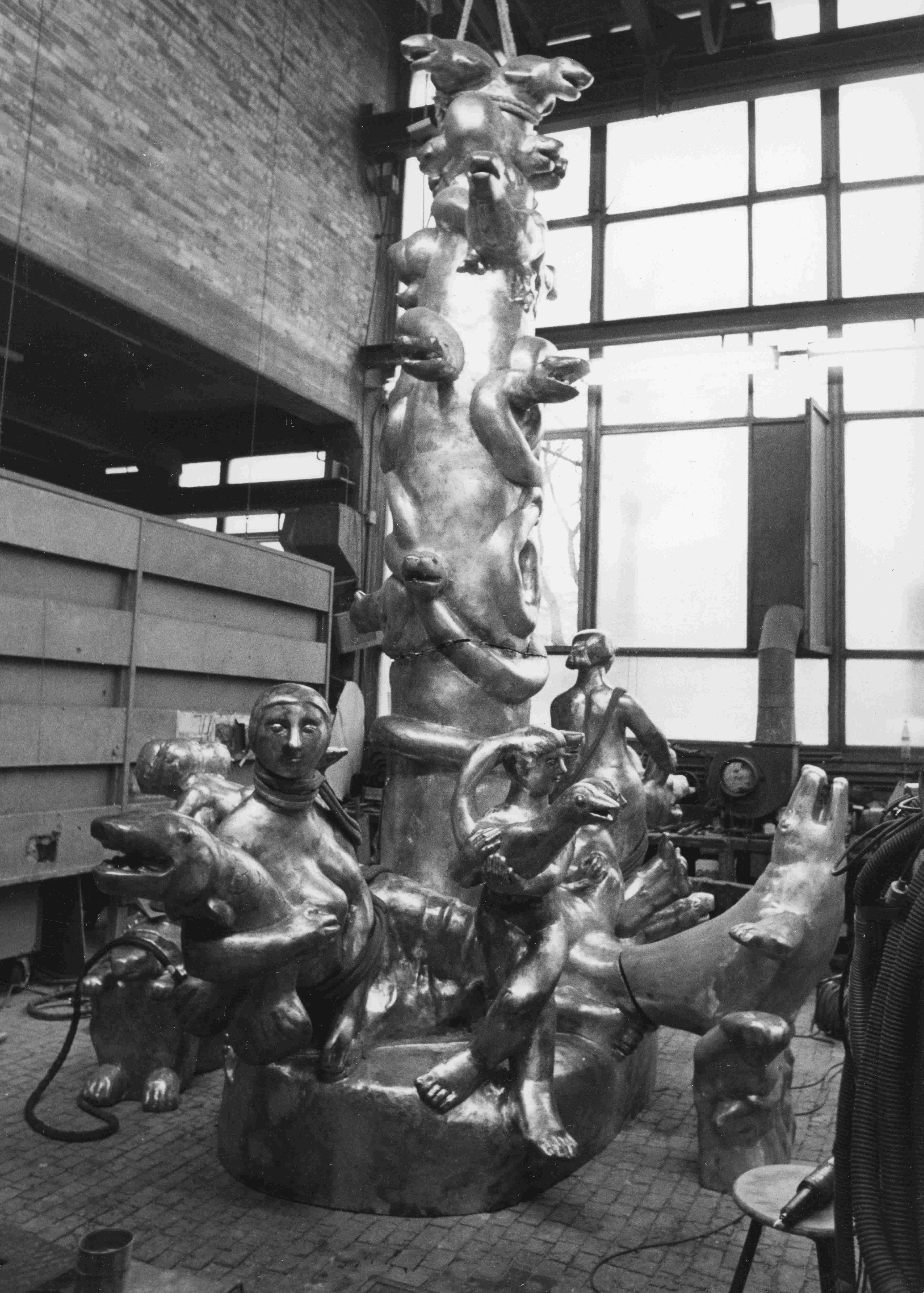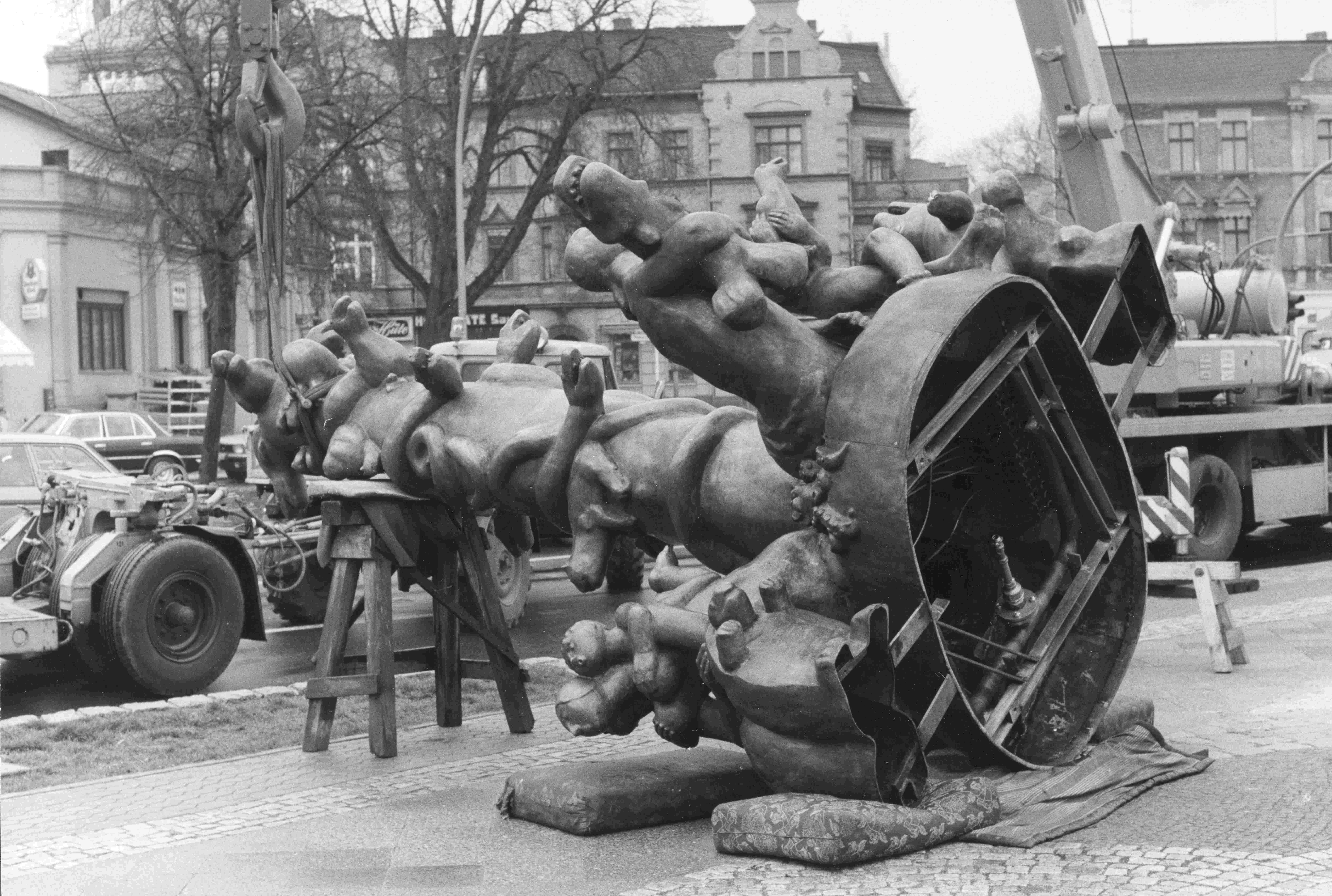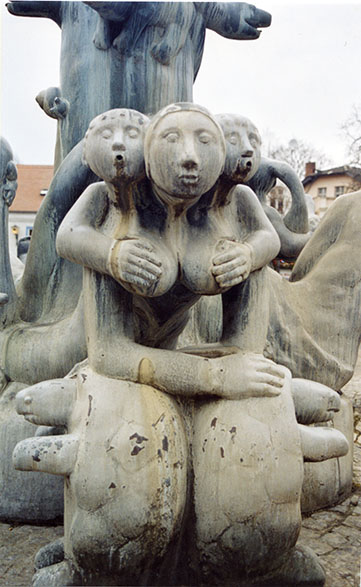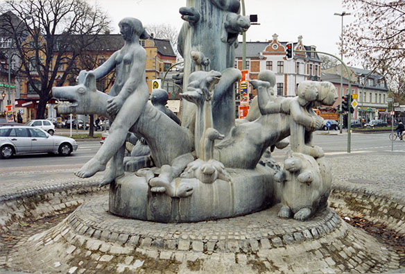 Die Platzanlage, genannt „Zeli-Eck“, ist mit einem aufwändigen Schmuckpflaster bestückt. Das Zentrum des Platzes wird durch einen aufgemauerten Rundwulst aus mittelgroßen grauen Granitsteinen markiert. In der Mitte des Brunnenbeckens befindet ein erhöhtes rundes Plateau mit konisch ansteigenden Kanten aus gleichem Material. Es bildet den Sockel für die vielgestaltige Brunnengruppe. Der vielfigurige Bronzebrunnen ist mit unterschiedlichen teils wasserspeienden Tier- und Menschengestalten bestückt, darunter Schildkröten, Tintenfische, Seehunde, Frösche, Gänse, Katzen und Schnecken. Die Figuren sind in burlesker, z. T. surrealer Manier miteinander verschlungen oder reiten aufeinander. Das Zentrum des Brunnens wird durch eine hohe von Schlangen umwundene und mit weiteren Tieren bestückte Stele gebildet. Wasserdüsen befinden sich an allen Seiten und in allen Höhenlagen (Jörg Kuhn).