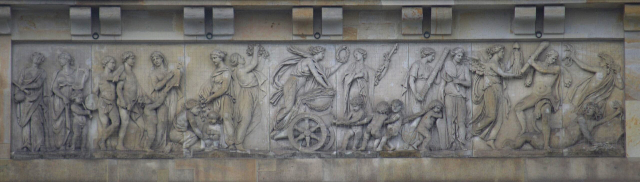 Die erste Darstellung (von links nach rechts gelesen) zeigt die Allegorie der Dichtkunst in Form einer Frau, die eine Schriftrolle und eine Kugel trägt. Darauf folgt die Allegorie der Musik, verkörpert durch eine Frau mit Lyra und einer begleitenden Erote. Sie blickt zur Dichtkunst. Es folgen die Malkunst und die Bildhauerei. Diese werden verkörpert durch zwei nahe beieinander stehende junge Männer, die mit einem entsprechenden Werkzeug (einer Palette und Pinsel sowie Hammer) ausgestattet sind. Beide blicken zur nächsten Figur, der Baukunst, die durch eine Frau mit Stift und Papier dargestellt wird. Die Allegorie des Überflusses wird dargestellt durch eine Frau, die ein Füllhorn über einem hockenden Mädchen und einer Putte ausleert. Sie wird gefolgt von der Allegorie der Freude, in Form einer Frau, die sich einem Strauß Blumen hingibt. Im Zentrum der Darstellung steht die Friedensgöttin Eirene mit einem Palmzweig auf einem Streitwagen, der an einer Lorbeergirlande von Eroten gezogen wird. Es folgt die Allegorie der Freundschaft in Form einer Frau, die extatisch eine Hand an ihre Brust drückt und in der anderen einen mit Efeu umwickelten Stab hält. Sie steht hinter dem ersten Eroten, der den Streitwagen zieht. Hinter dem letzten Eroten des Streitwagens ist die Eintracht in Form einer Frau zu sehen, die ein römisches Fasces (Rutenbündel) schräg in beiden Händen hält. Sie wird gefolgt von der Staatsklugheit. Figürlich dargestellt wird diese durch eine Frau mit Spiegel und Schlange sowie einem aufgestützten Bootsruder. Der Sieg wird durch die geflügelte Göttin Nike personifiziert, die ein Tropaion (Symbol für die Flucht des Feindes bestehend aus einem Helm, Panzer und zwei Schilden) hält. Es folgt die Allegorie der Tapferkeit in Form des Herakles im Löwenfell, der einen Knüppel in der Hand hält und mit diesem zwei weitere Figuren in die Flucht zu jagen scheint. Diese beiden Figuren sind die Allegorien des Neids und der Zwietracht, welche beide durch weibliche Figuren dargestellt werden. Der Neid kauert auf dem Boden und zur Hälfte als Fisch dargestellt und trägt drei Schlangen mit sich. Die Zwietracht hält ebenfalls Schlangen in der Hand. (Vgl. Demandt, 2004, 31 | Vgl. Kulturdatenbank, 2005).