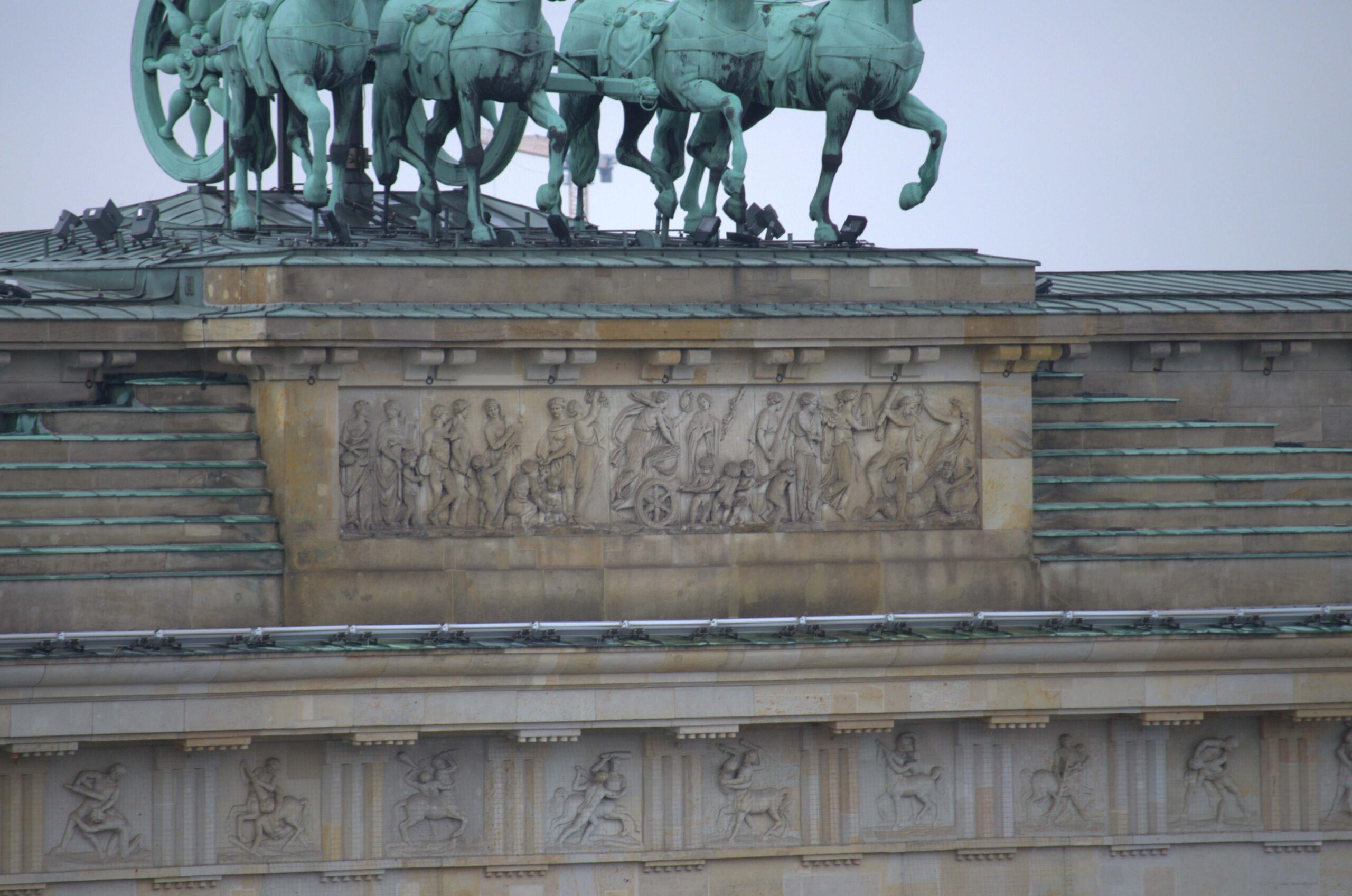 Das Attikarelief befindet sich an der Ostseite des Brandenburger Tors auf dem Sockel der Quadriga. Dargestellt sind dabei Szenen und Darstellungen in Form von 15 Allegorien, unter anderem der Künste und Wissenschaften, wie auch einiger Tugenden. Thematisch wird der Siegeszug der Friedensgöttin dargestellt. (Vgl. Denkmaldatenbank) Die Darstellung und gezeigten Figuren sind antikisierend gestaltet und gekleidet. Die Szene ist bewegt und dynamisch.