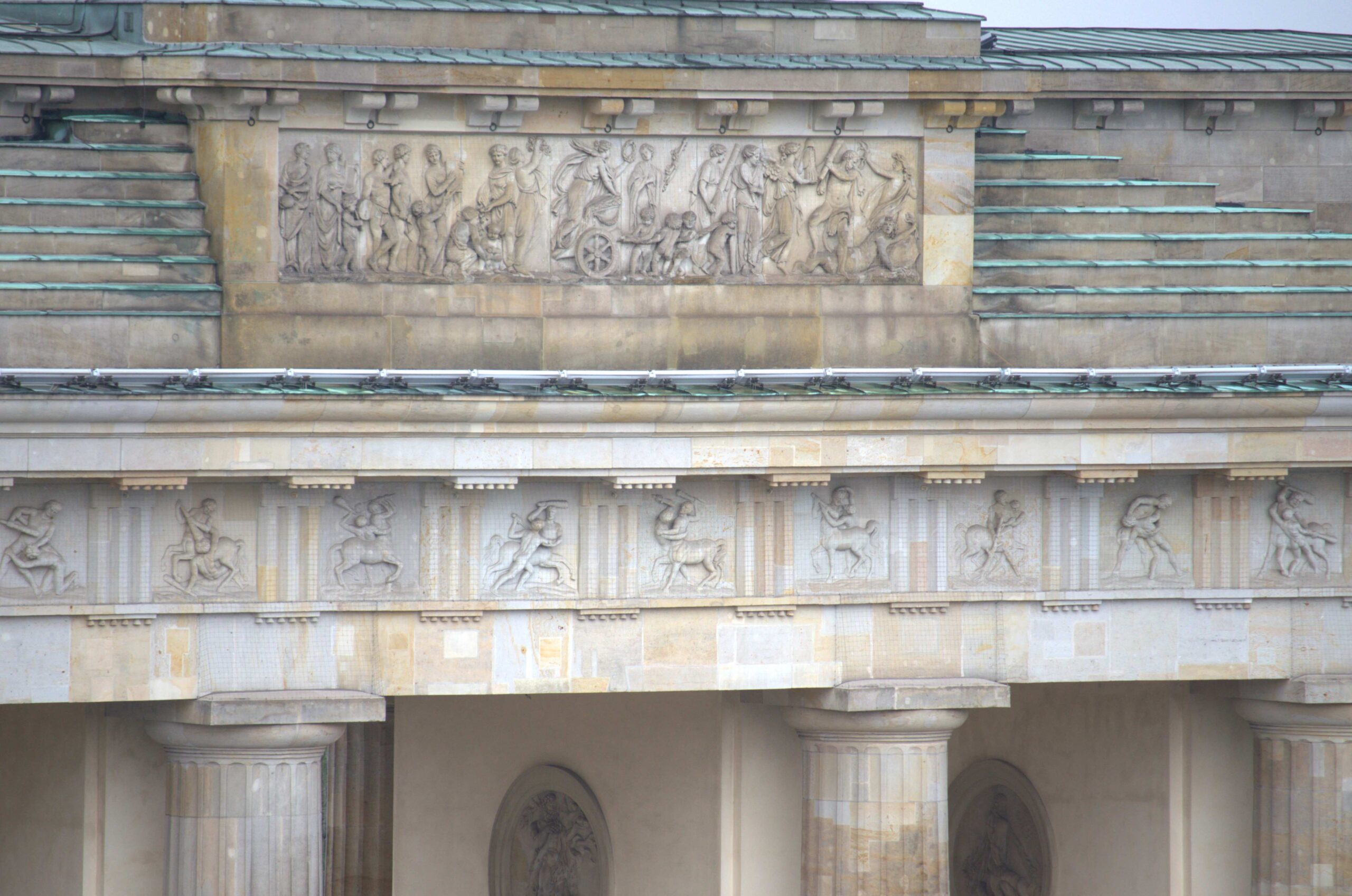 Das Attikarelief befindet sich an der Ostseite des Brandenburger Tors auf dem Sockel der Quadriga. Dargestellt sind dabei Szenen und Darstellungen in Form von 15 Allegorien, unter anderem der Künste und Wissenschaften, wie auch einiger Tugenden. Thematisch wird der Siegeszug der Friedensgöttin dargestellt. (Vgl. Denkmaldatenbank) Die Darstellung und gezeigten Figuren sind antikisierend gestaltet und gekleidet. Die Szene ist bewegt und dynamisch.