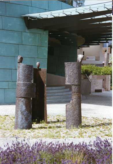 Drei braun-goldbraun patinierte Bronzefiguren sind in einer Dreieckspositionierung einander gegenübergestellt. Unter dem Titel „Zusammenkunft“ sind hier stilisierte Menschengestalten dargestellt, sie sich einander zuwenden. Sie bestehen jeweils aus einem halbrund geformten Bronzeblech und einem aufgesetzten, annähernd ovalen, relativ kleinen Kopf. Die hochkant aufgestellten Körper werden lediglich durch die Köperform andeutende Einkerbungen und Bänder strukturiert (Susanne Kähler).
