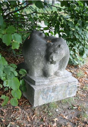 Auf einem kleinen Standbereich mit Plattendeckung steht die aus Muschelkalkstein gearbeitete Skulptur zweier Bären, die in antithetischer Anordnung sich aneinanderschmiegen. Die Gruppe steht auf einem rechteckigen Sockelblock (Jörg Kuhn).