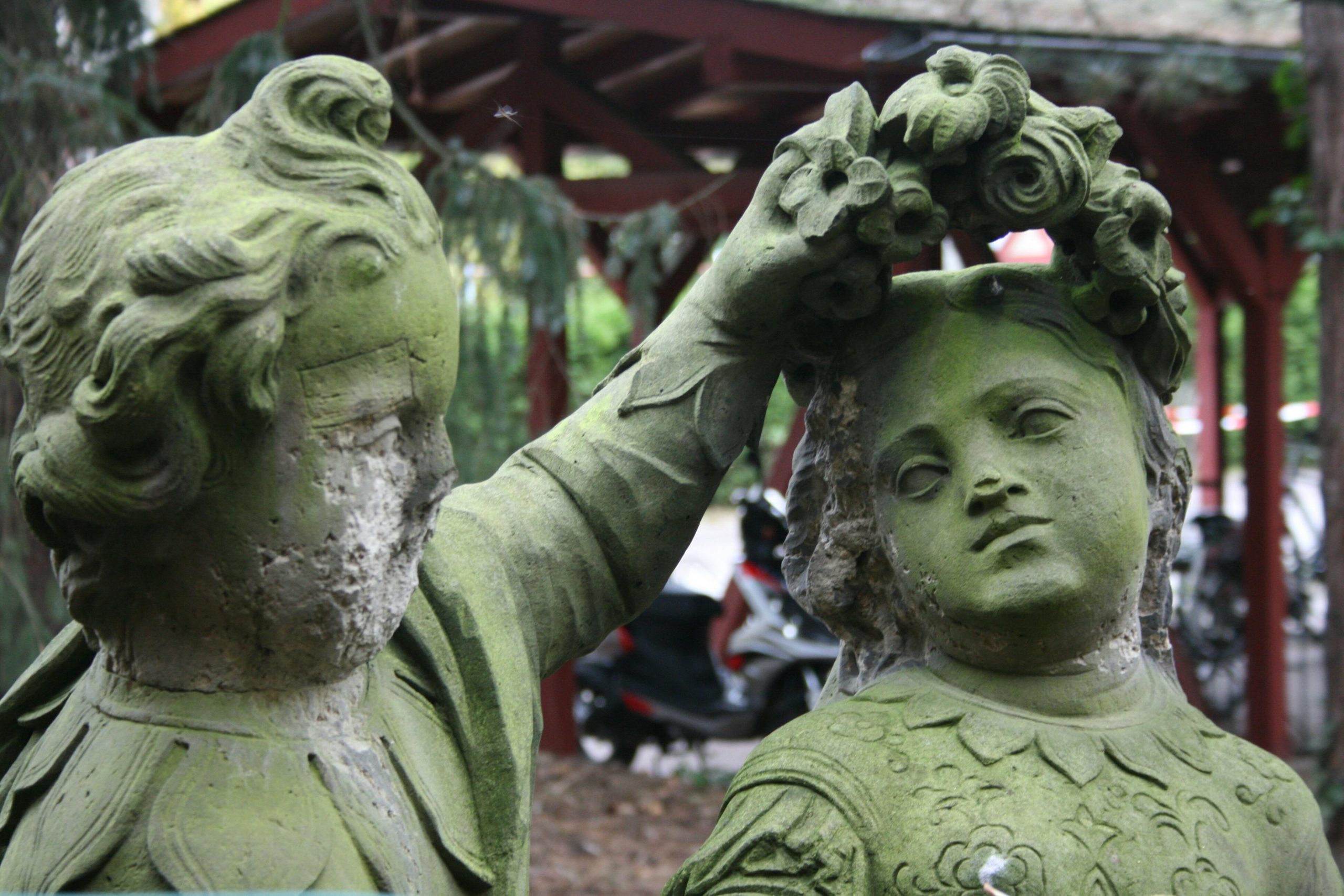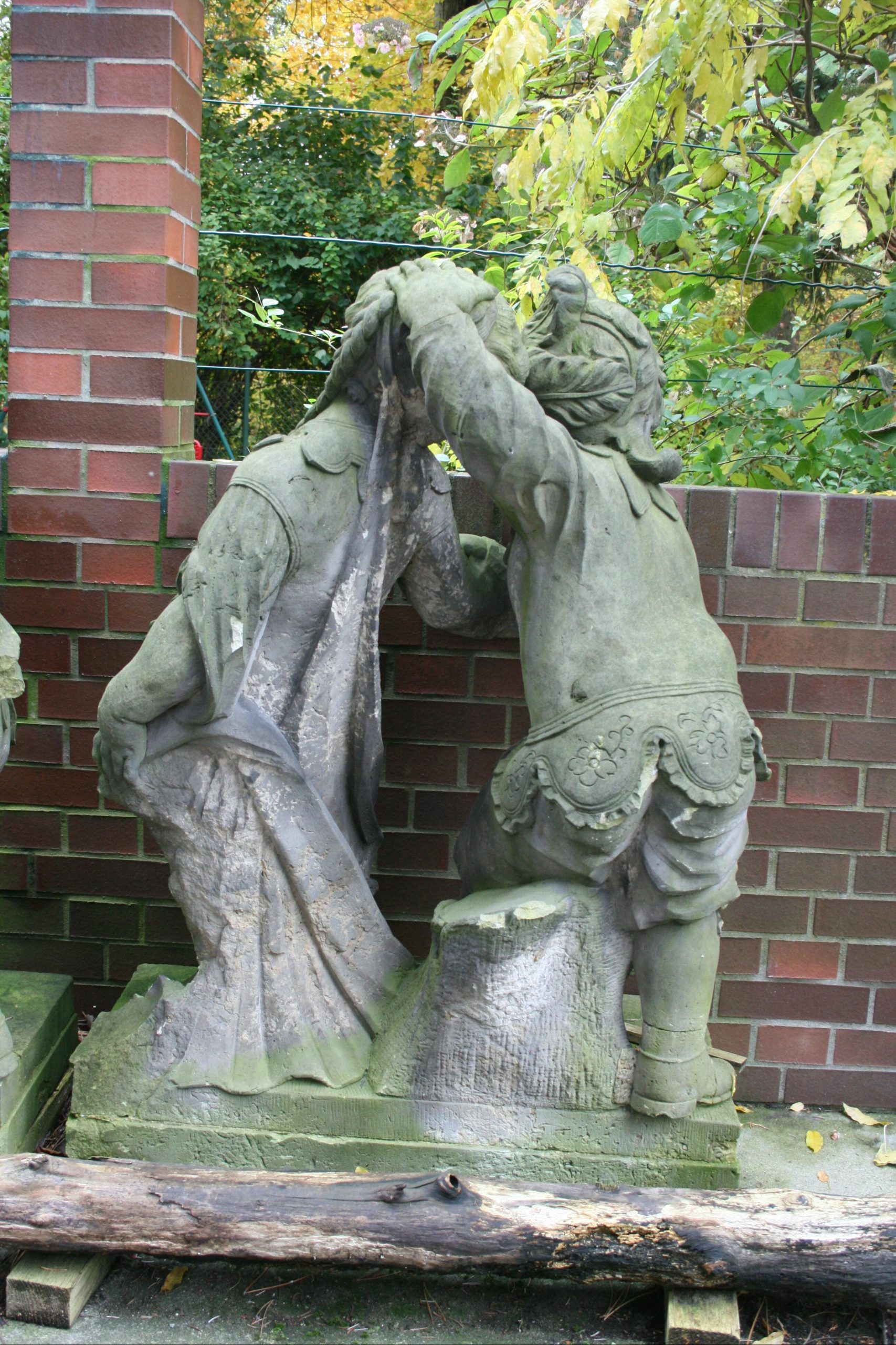 Die beiden Puttengruppen sind in den 1960er oder 1970er Jahren dem technischen Leiter des Botanischen Gartens, Herrn Kraft, aus Privatbesitz geschenkt worden. Sie befanden sich vor der Überführung in den Botanischen Garten im Garten des Hauses Thielallee 12 in Berlin-Dahlem. Die beiden Figurengruppen sind allerdings nicht für den Garten des Hauses Thielallee 12 geschaffen worden, sondern sind zu einem vorläufig unbekannten Zeitpunkt dorthin gebracht worden. Möglicherweise hat der private Vorbesitzer die zwei Gruppen im Kunsthandel erworben. Die beiden Figurengruppen sind mit Sicherheit für einen Garten geschaffen worden, wobei nicht mit abschließender Sicherheit die Frage zu beantworten ist, ob sie auf einem Sockelpostament frei innerhalb eines barocken Gartens gestanden haben, oder eingebunden in eine Gartenarchitektur, wie Kolonnaden oder eine Tor- oder Traillagensituation. Die Zierlichkeit schließt weitgehend eine sehr hohe, betrachterferne Aufstellung aus. Eine gewisse Unteransichtigkeit scheint aber eine Aufstellung mindestens in Augenhöhe des Betrachters zu belegen. (Jörg Kuhn, Susanne Kähler)