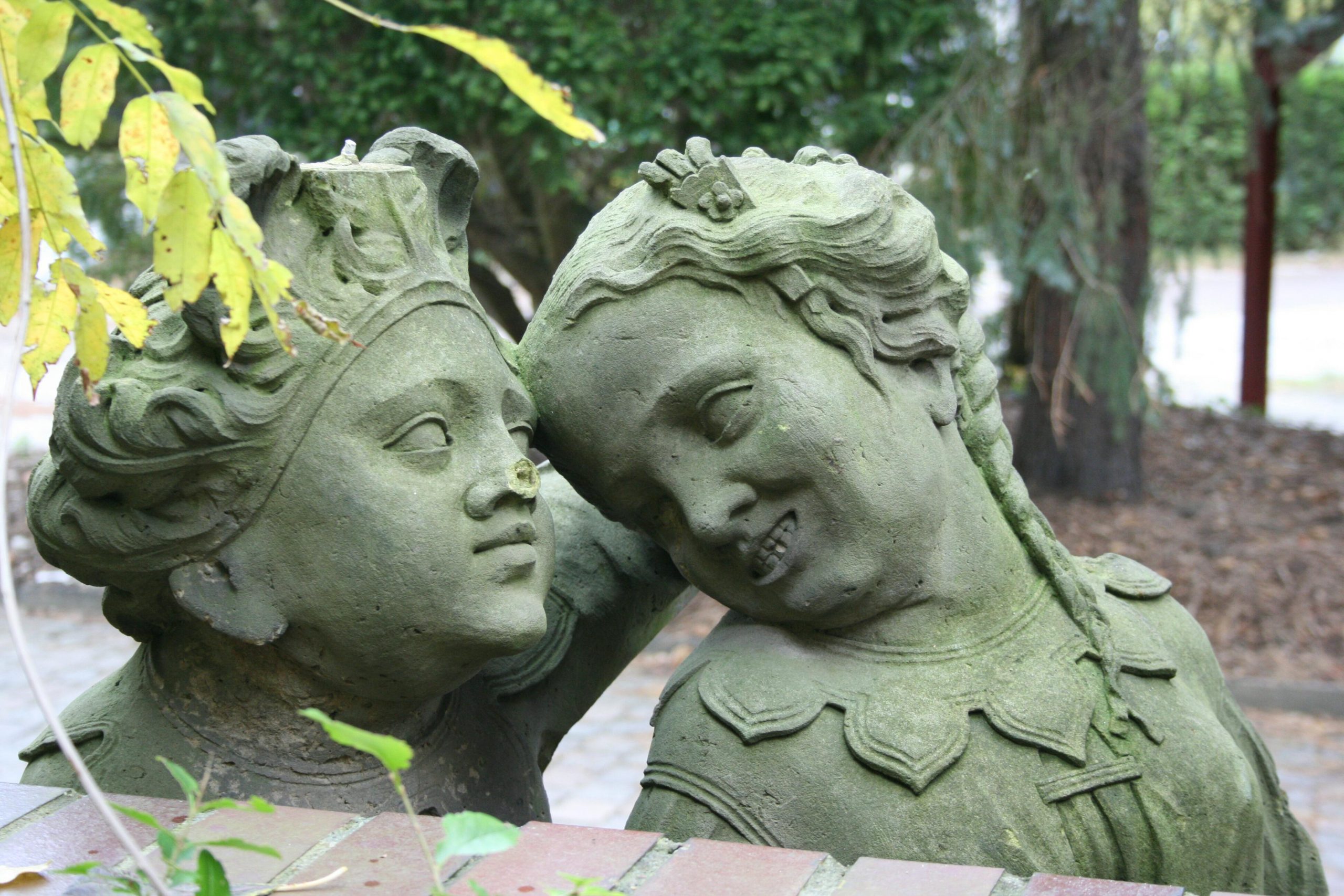 Beide Figurengruppen stehen auf längsrechteckigen Plinthen. Die mit einem Naturrelief belebten Plinthen stehen ihrerseits auf längsrechteckigen Platten, die der Gruppe zusätzlich Halt geben, was notwendig ist, da die Plinthen vermutlich schon ursprünglich nicht aus einem Stück bestanden, sondern Anstückungen aufweisen. Beide Puttengruppen zeigen ein tanzendes Paar, jeweils links den Kavalier und rechts die Dame. Beide Figurengruppen haben hinten als Teil der Kavaliersfigur eine Stütze in Gestalt eines Baumstumpfes. Dieses trägt zur Stabilisierung der gesamten Gruppe, aber insbesondere der beiden Kavaliersfiguren bei, denn deren Beine sind freier ausgearbeitet, als die unteren Partien der weiblichen Figuren, deren Stabilität durch die Darstellung eines langen und damit massiven Rockes gewährleistet ist.