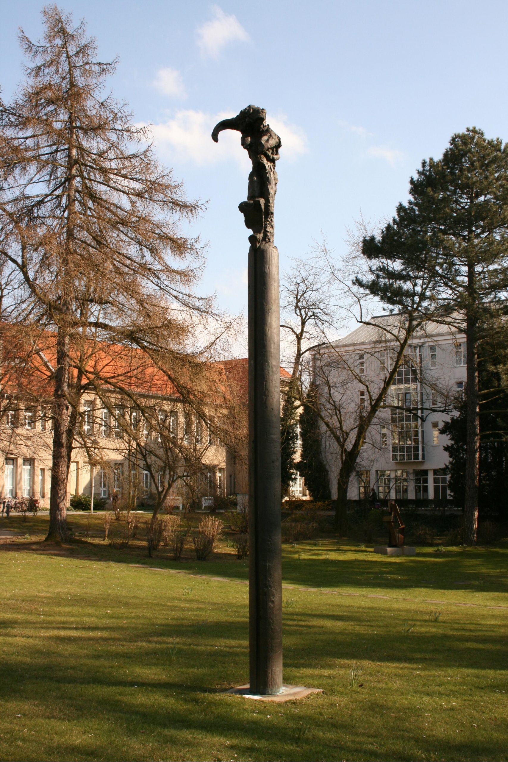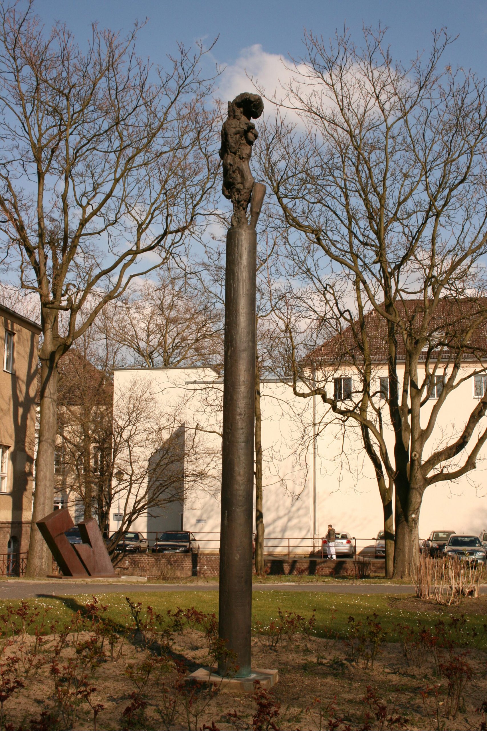 Auf der Rasenfläche der Grünanlage hinter dem Altbau des Auguste-Viktoria-Krankenhauses stehen in einigen Metern Entfernung voneinander auf hohen, schlichten, dunkel patinierten bronzenen Säulen zwei abstrahierte menschliche Figuren in unterschiedlichen amorphen Formen, sie scheinen einander zugewandt. Die Figuren selbst haben eine Größe von etwa zwei Metern (Jörg Kuhn, Susanne Kähler).