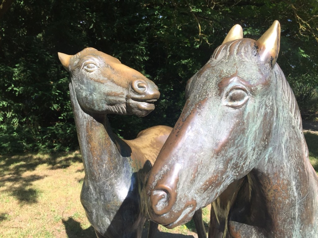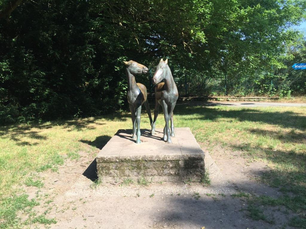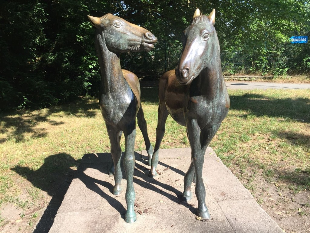 Zwei lebensgroße Fohlen stehen auf einem aus Betonplatten bestehenden Sockel.