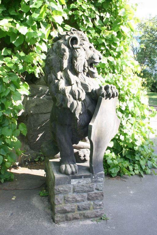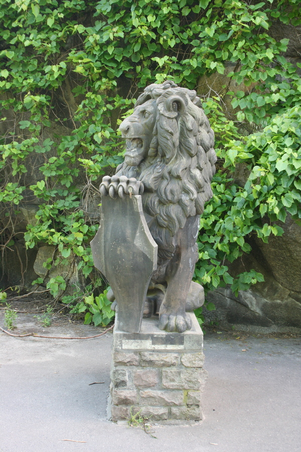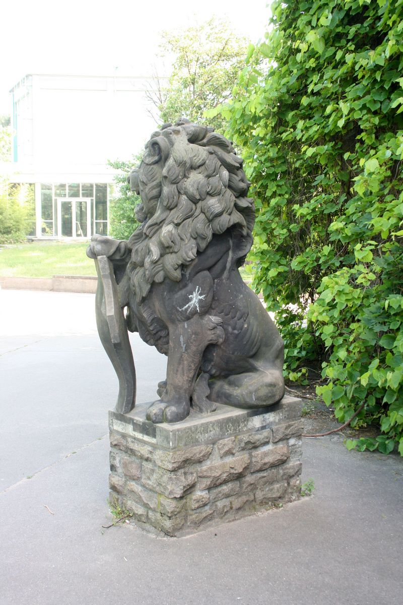 Herkunft nicht abschliessend geklärt. Vor der Aufstellung im Tierpark (um 2000) aufwändig restauriert. "Bei unseren 'Portallöwen' ist uns weder der Schöpfer noch die Herkunft bekannt. Sie (...) wurden im Auftrage des Bezirksamtes Berlin-Weißensee restauriert. Bei der Restaurierung (...) mußte der Berliner Restaurator Walter Brückner etwa 90 Teile wieder anfügen. (...) das Bezirksamt (...) schenkte (...) die Löwen dem Tierpark, wo sie den Zugang zum Innenhof des Alfred-Brehm-Hauses flankieren" (Enrico Matthies, 2009, S. 72).