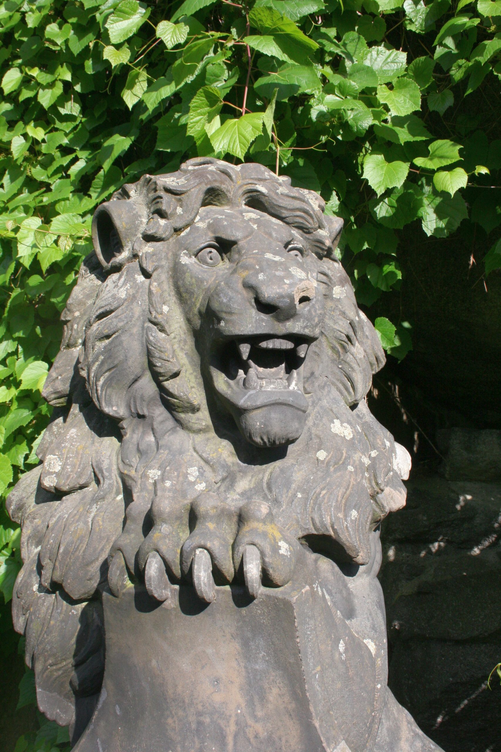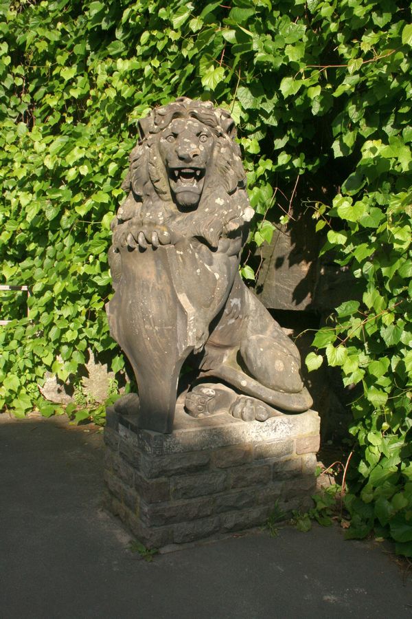 Auf zwei rechteckigen, gemauerten Sockeln sitzen zwei heladisch aufgefasste Löwen mit geöffnetem Maul und drohend aufgerissenen Augen. Sie halten je ein Schild in jeweils einer ihrer kräftigen und Krallenbewehrten Pranken. Die stilisiert formulierten Tiere sind sichtbar aufeinander bezogen und sind mit einiger Sicherheit auch schon bei ihrer ersten – bisher unbekannten – Aufstellung als zusammengehörige Portal-Wächter verwendet worden (Jörg Kuhn).