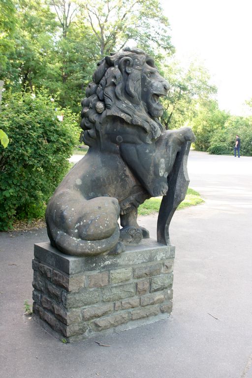 Auf zwei rechteckigen, gemauerten Sockeln sitzen zwei heladisch aufgefasste Löwen mit geöffnetem Maul und drohend aufgerissenen Augen. Sie halten je ein Schild in jeweils einer ihrer kräftigen und Krallenbewehrten Pranken. Die stilisiert formulierten Tiere sind sichtbar aufeinander bezogen und sind mit einiger Sicherheit auch schon bei ihrer ersten – bisher unbekannten – Aufstellung als zusammengehörige Portal-Wächter verwendet worden (Jörg Kuhn).