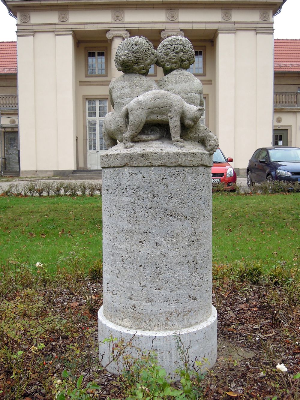 Die Figurengruppe hatte Ignatius Taschner ursprünglich für den von Ludwig Hoffmann entworfenen Schulkomplex Zeppelinplatz/Lütticher Straße (1907/09) angefertigt. Sie wurde als Replik für das Gene-sungsheim übernommen. Bauzeitlich wurde die Säule von einem Rundbeet umfasst, dessen Bepflan-zung auch die Säule umrankte. Um 1955 wurde die Säule mit der Kindergruppe abgebaut und auf dem Grünplatz vor dem Haus 20 ein Rundbrunnen mit Tierskulpturen angelegt. Die Skulptur wurde versetzt an den Verbindungsweg zwischen den Häusern 34 und 33. Aufgrund des schlechten Zustandes des Brunnens wurde er 2014 abgebrochen und im Oktober 2015 die bauzeitliche Aufstellung der Kindergruppe wiederhergestellt. Dafür war die Rekonstruktion des ursprünglichen Unterbaus der Säule erforderlich. Als Vorbild diente die entsprechende Originalausbildung der Skulpturenanlage beim Haus 13 (Objekt Nr.70), die den südlichen Abschluss der zentralen Mittelachse bildet. Die frei stehende Skulptur ist Teil der 1909-1916 nach einem Entwurf von Stadtbaurat Ludwig Hoffmann ausgeführten IV. Städtischen Irrenanstalt (Genesungsheim) in Berlin-Buch, Wiltbergstraße 50/92. Zur Gesamtanlage gehörten bildhauerisch gestaltete Brunnen, mehrere Skulpturen sowie vielfältiger Reliefschmuck an den Gebäuden. Der weiträumige Baukomplex war zunächst als Nervenklinik geplant, diente ab 1919 als Kindergenesungsheim und seit 1941 als Allgemein-Krankenhaus. Die trotz der Nutzungsänderungen weitgehend in ihrer bauzeitlichen Form erhaltene Klinikanlage war in Struktur und Gestaltung auf die ursprünglich geplante Funktion bezogen. Hoffmann schuf einen kompakten und nach außen abgeschlossenen Komplex mit mehr als 30 Bauten, für die er eine ungewöhnliche architektonische Vielfalt fand. 1963 kam es zur Gründung des Klinikums Berlin-Buch mit fünf medizinischen Bereichen. Hier wurde der Medizinische Bereich I eingerichtet. Ab 2012 vollzieht sich die Umwandlung des Areals in eine Wohnanlage mit Bildungs-, Sozial- und Gewerbebauten zum so genannten „Ludwig Hoffmann Quartier“ bei Erhaltung der denkmalgeschützten Gebäude und der Wiederherstellung der gärtnerischen Anlange mit ihrem Skulpturenschmuck (vgl.: Landesdenkmalamt Berlin - Denkmalerfassung Gesamtanlage (Kennziffer 09066166), - Denkmalerfassung Gartendenkmal (Kennziffer 09046072); Klinikum Berlin Buch Medizinischer Bereich I, Wiltbergstraße 50, Gartendenkmalpflegerisches Gutachten des MB I. Büro Dr. Jacobs und Hübinger, August 1993, Abb.146 -147; Ludwig Hoffmann´s Genesungsheim in Berlin-Buch. Klinikum Buch-Medizinischer Bereich I, Gutachten angefertigt v. Dieter Leukert 1993/1994; Dieter Leukert, Brunnen, Skulpturen und bildhauerischer Schmuck der Gebäude im Ludwig Hoffmann Quartier, 2015/2016 (Manuskript), S.107; Hoffmann, L., Aus Alt- und Neu-Berlin, Ausstellung der Akademie der Künste Berlin, Berlin 1922, Seite 2) (Jürgen Tomisch).